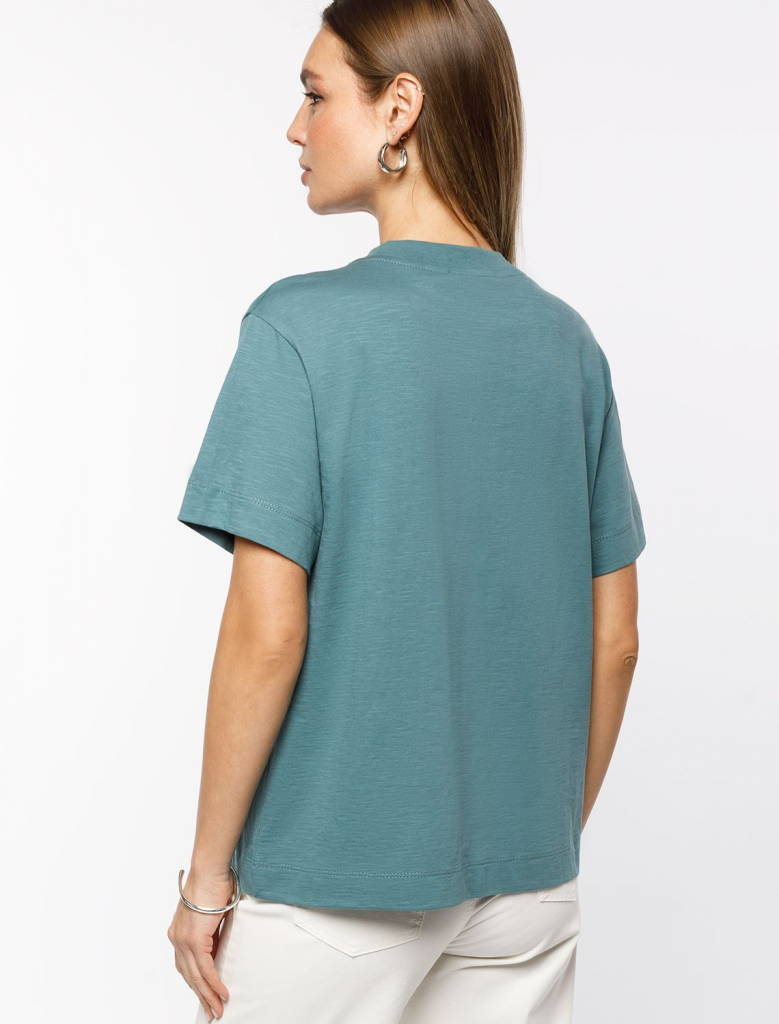 Футболка выполнена из фактурного полотна из 100% хлопка. Модель с лаконичным авторским принтом легко впишется в любой весенне-летний гардероб. Ткань имеет характерный рисунок черточки за счет сочетания разных волокон хлопка 140-150 г. Хорошо держит форму и поддерживает комфортный микроклимат в течении дня.
