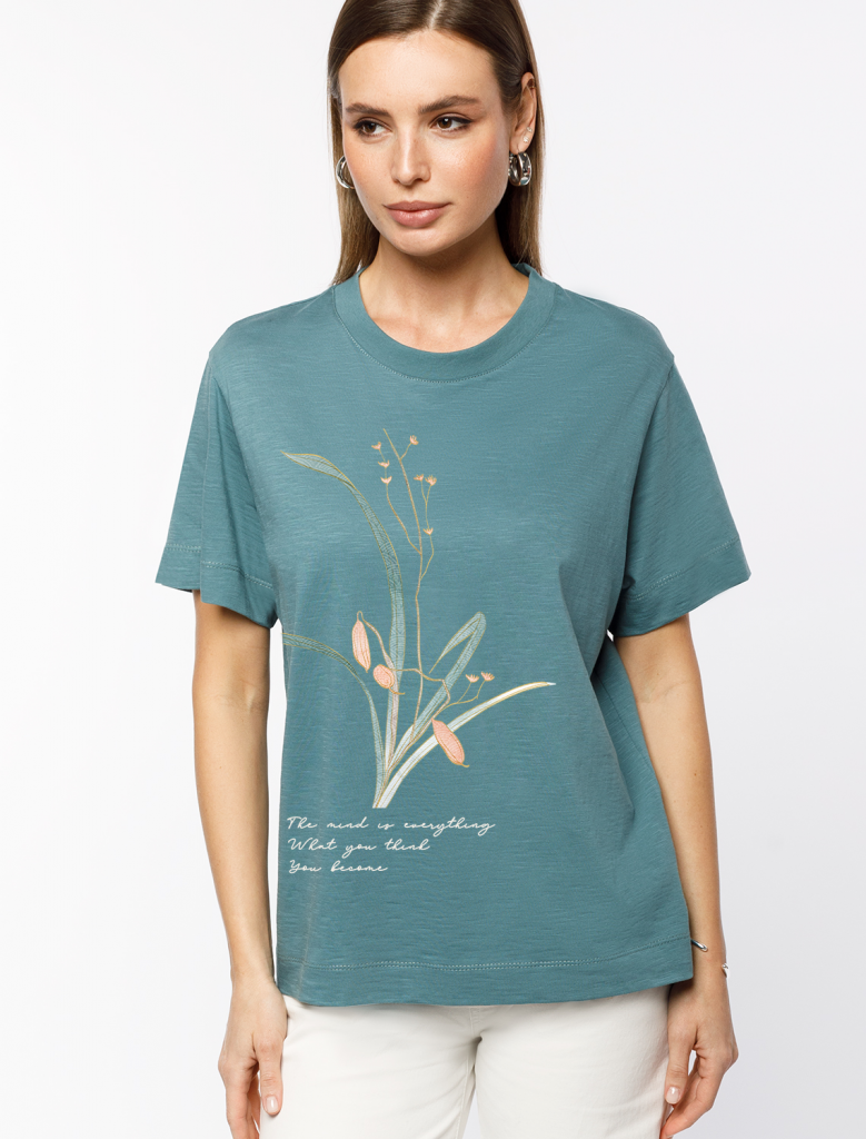 Футболка выполнена из фактурного полотна из 100% хлопка. Модель с лаконичным авторским принтом легко впишется в любой весенне-летний гардероб. Ткань имеет характерный рисунок черточки за счет сочетания разных волокон хлопка 140-150 г. Хорошо держит форму и поддерживает комфортный микроклимат в течении дня.