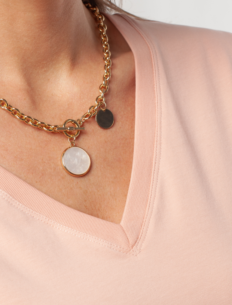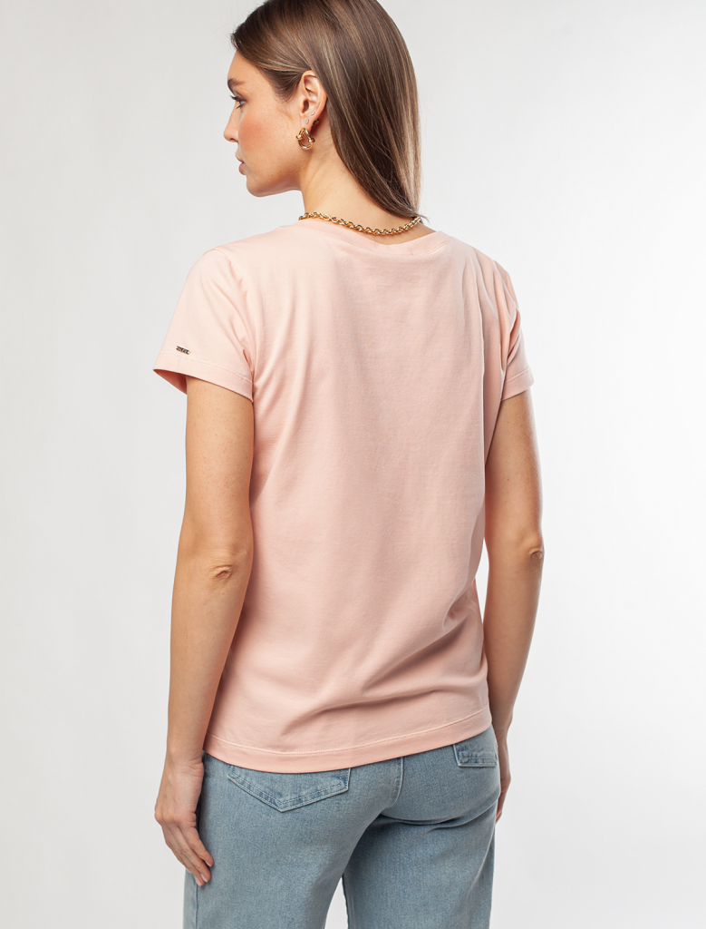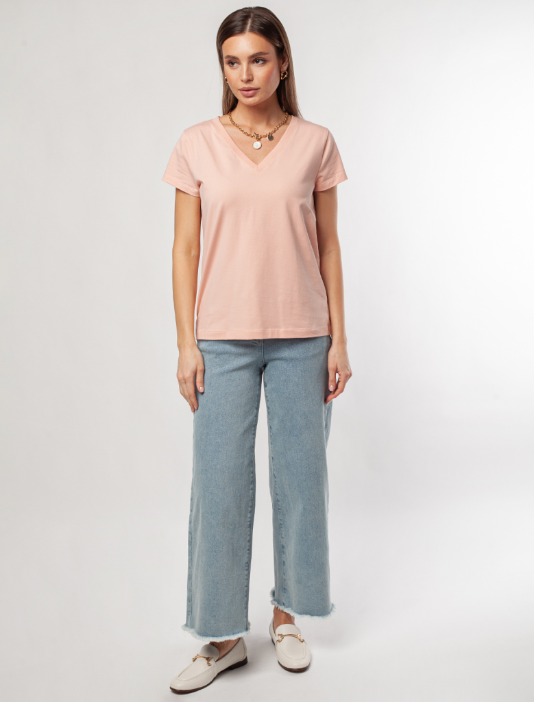 Однотонная футболка с V-образным вырезом выполнена из премиального хлопка. Добавление эластана в состав изделия способствует формоустойчивости. Самое высокое качество длинноволокнистых хлопковых волокон обеспечивает комфорт в любое время года.Универсальная базовая будет уместна не только в повседневном образе с денимом, но и в офисе с нестрогим дресс-кодом, в паре с брюками и жакетом.