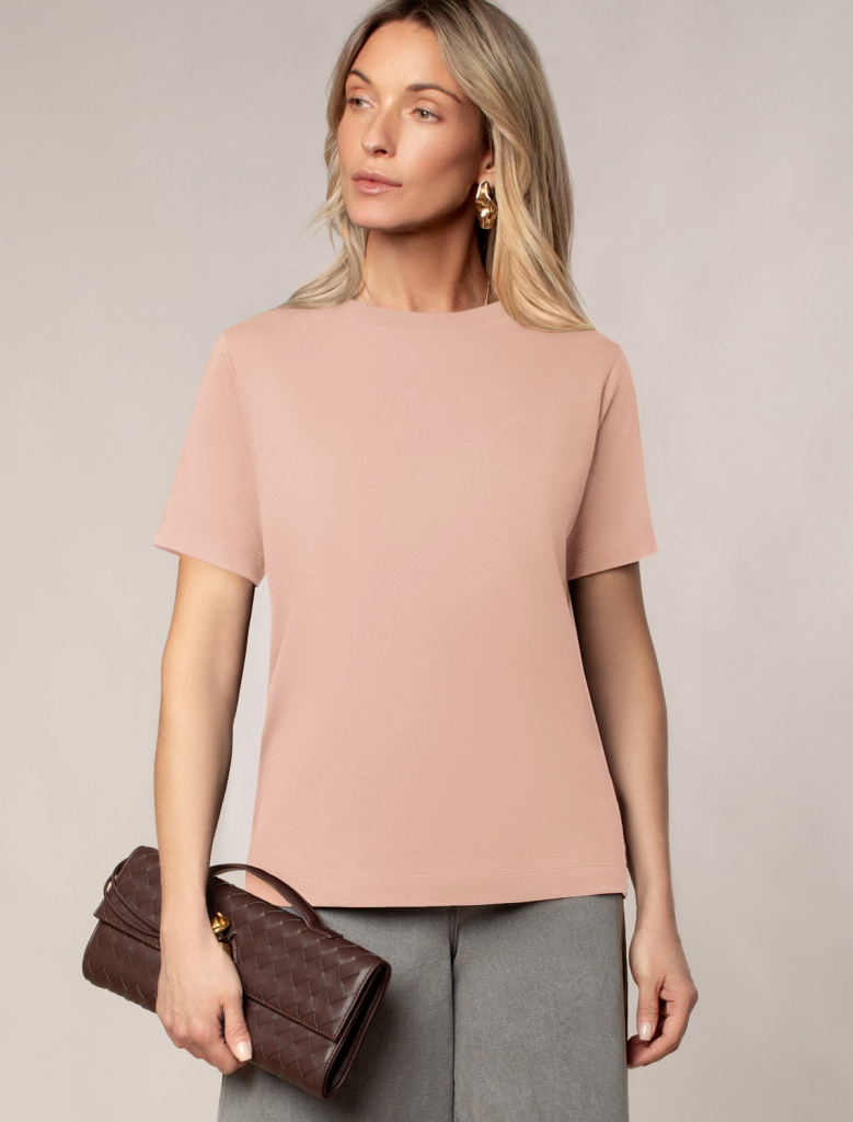 Базовая однотонная футболка из премиального хлопка. Горловина выполнена из рибаны в тон изделия, Добавление эластана в состав изделия способствует формоустойчивости. Самое высокое качество хлопковых волокон обеспечивает комфорт в любое время года. Идеально держит форму и сохраняет внешний вид в течение долговременного использования. Универсальная базовая вещь для ваших стилистических решений. Изделие дополнено металлическим логотипом бренда на рукаве.