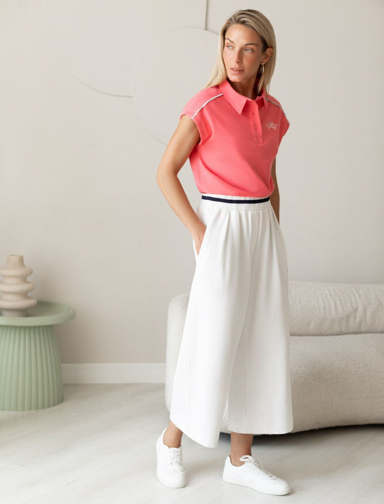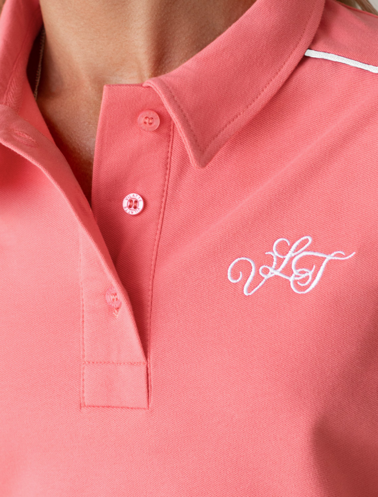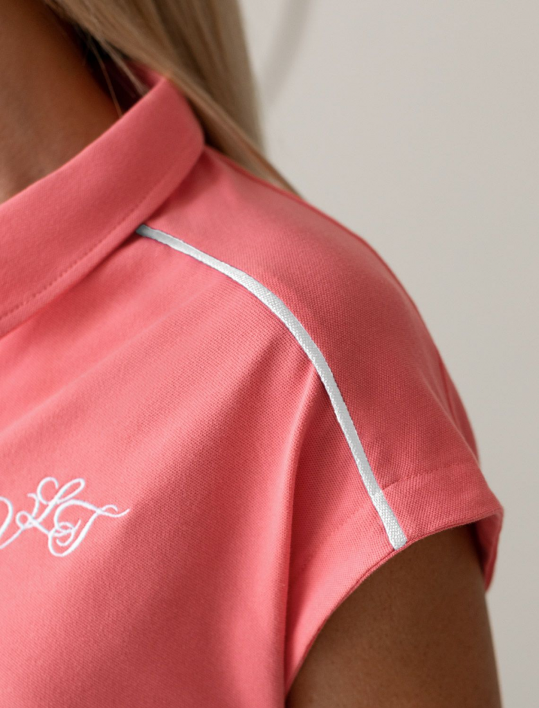 Футболка-поло выполнена из фактурного трикотажа. Модель с цельнокроеным рукавом дополнена вышитым логотипом и контрастными полосками из основного полотна по плечам. Свободный силуэт подходит для любой фигуры, хорошо смотрится в заправку с брюками и юбками теннисной коллекции. Идеально с джинсами в повседневном аутфите.