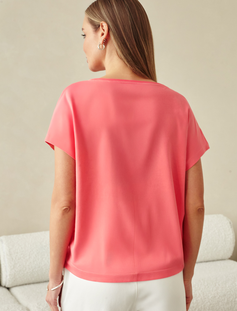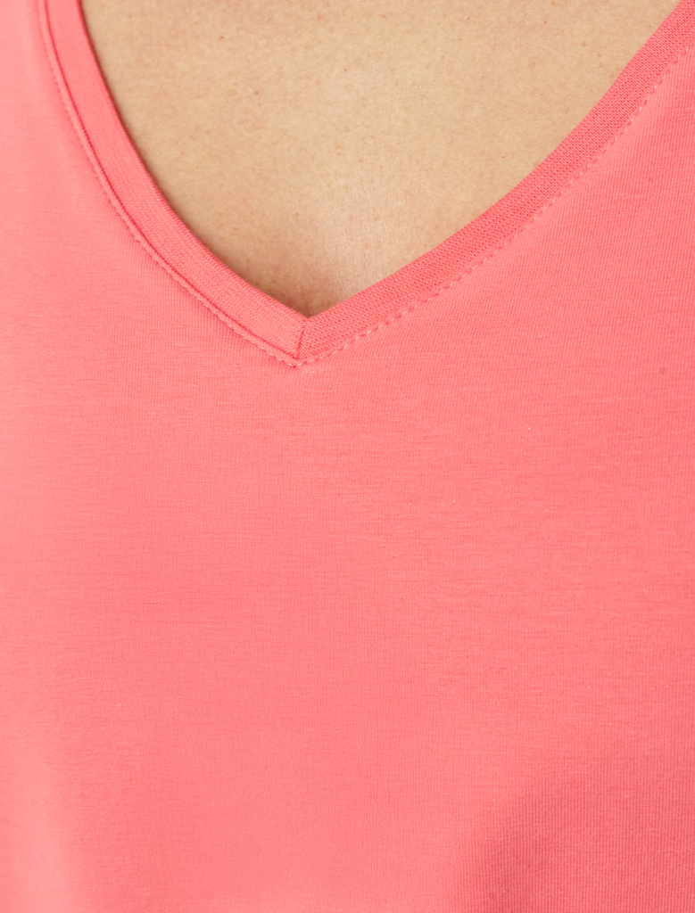 Футболка с цельнокроеным рукавом выполнена из премиального хлопка. Базовая однотонная модель идеально впишется в любой гардероб. V-вырез подчеркивает ключицы и удлиняет шею, хорошо сочетается с жакетами или кардиганами. Изделие дополнено металлическим логотипом бренда.