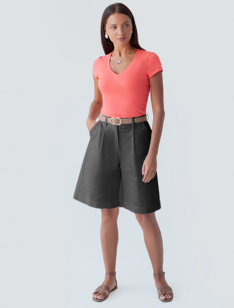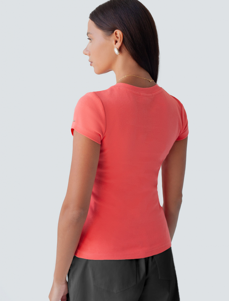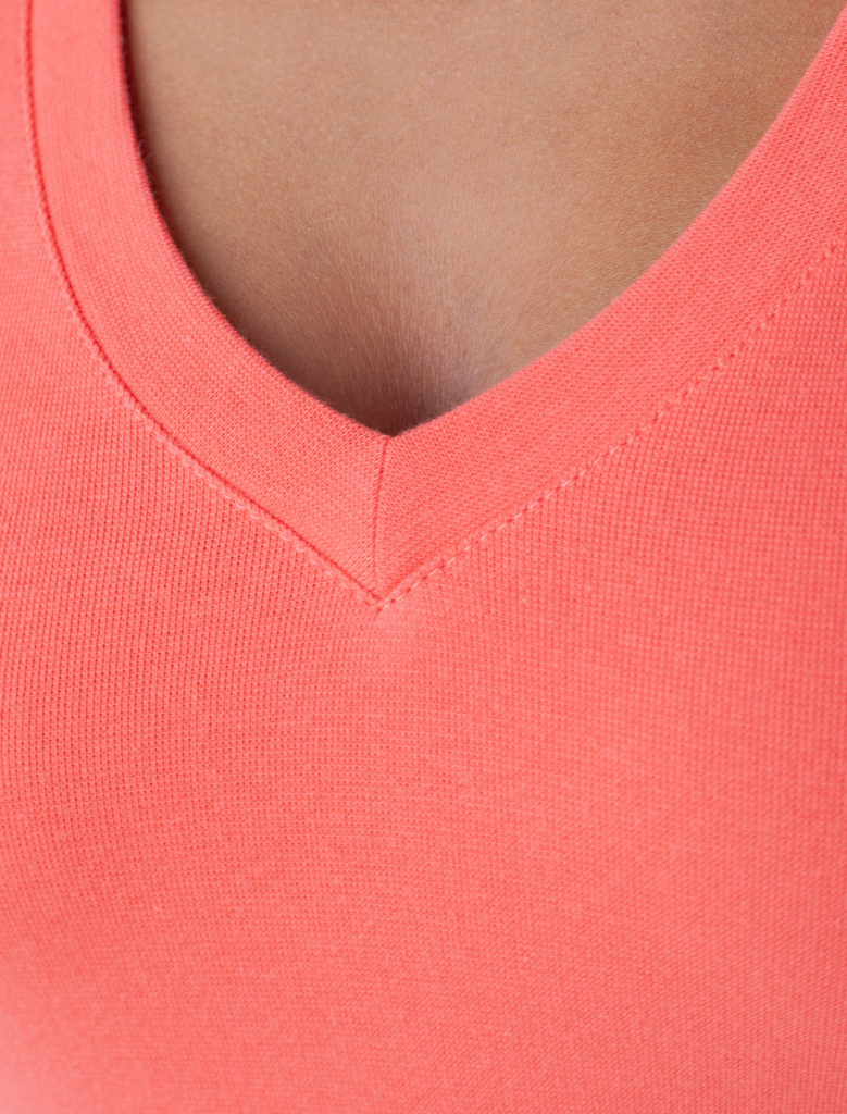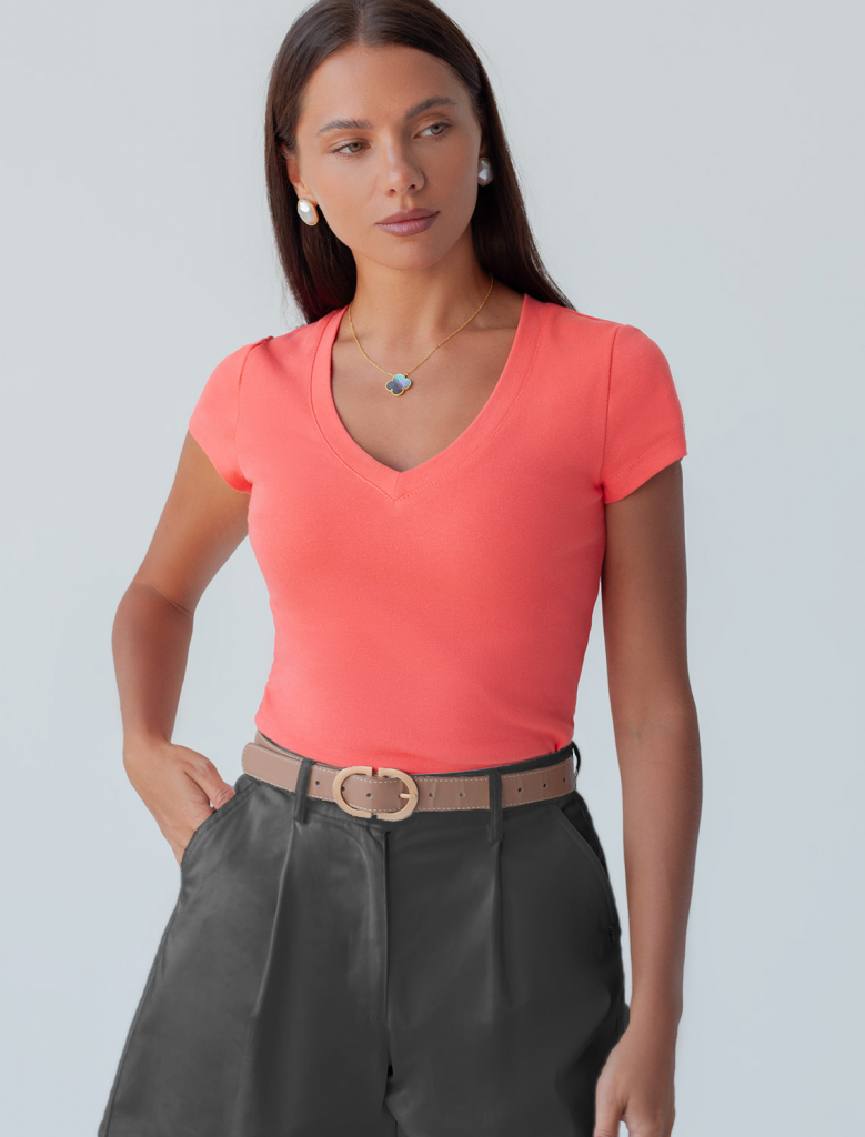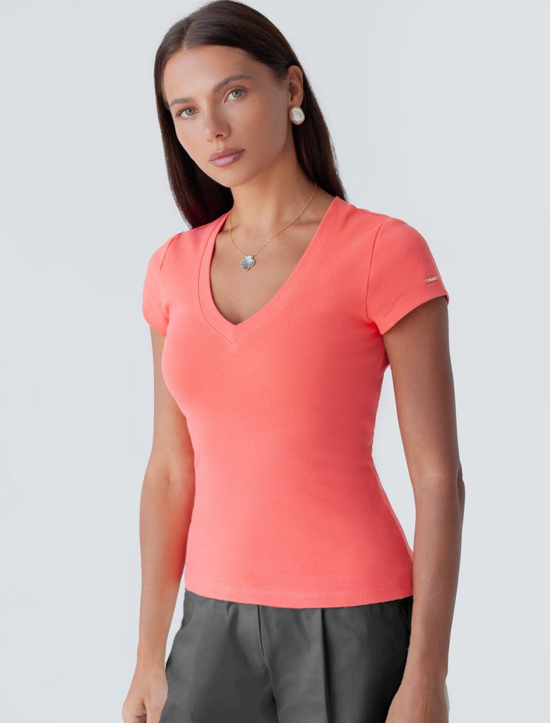 Облегающая футболка с V-образным вырезом в цвете розовый коралл создаст утонченный образ. Идеальная базовая модель для вашего гардероба! Глубокий V-образный вырез подчеркивает линию шеи и зрительно удлиняет силуэт. Футболка выполнена из хлопка с добавлением эластана, которая мягко облегает контуры тела, подчеркивая достоинства фигуры. Универсальный вариант для создания стильных повседневных образов.