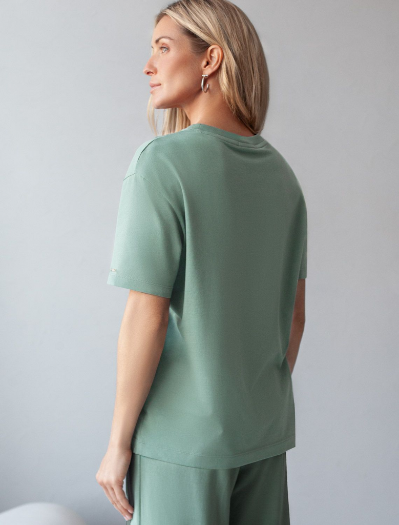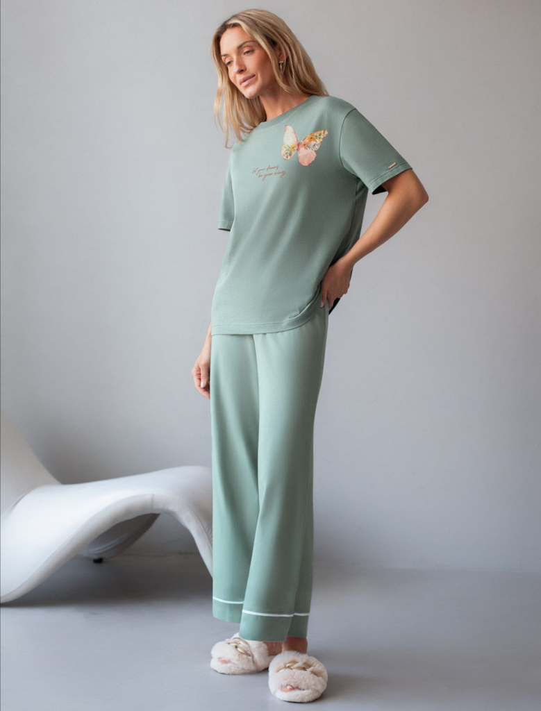 Футболка светло-оливкового цвета изготовлена из премиального хлопка с эластаном, она обеспечивает невероятное ощущение уюта и легкости. Натуральный материал сохраняет форму и цвет после множества стирок, обеспечивая долговечность изделия, а его высокая воздухопроницаемость создает ощущение свежести даже в течение долгого дня. Особое внимание привлекает стильный принт в виде бабочки с минималистичной надписью. Перевод надписи: Let your dreams be your wings - Пусть твои мечты станут твоими крыльями. Принт выполнен красками с устойчивым покрытием, который добавляет изделию оригинальности и позволяет выразить индивидуальность. Свободный крой футболки дарит удобство и не стесняет движений, что делает ее идеальной для повседневной носки или активного отдыха, подчеркивает современный взгляд на моду. На рукаве металлический логотип бренда. Подойдет девушкам и женщинам на любую фигуру, вы будете чувствовать себя в ней уверенно и комфортно. Отлично впишется в гардероб благодаря универсальному дизайну, который легк