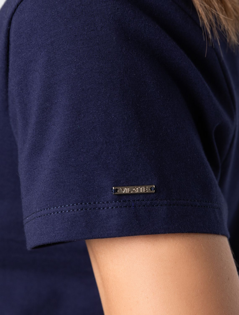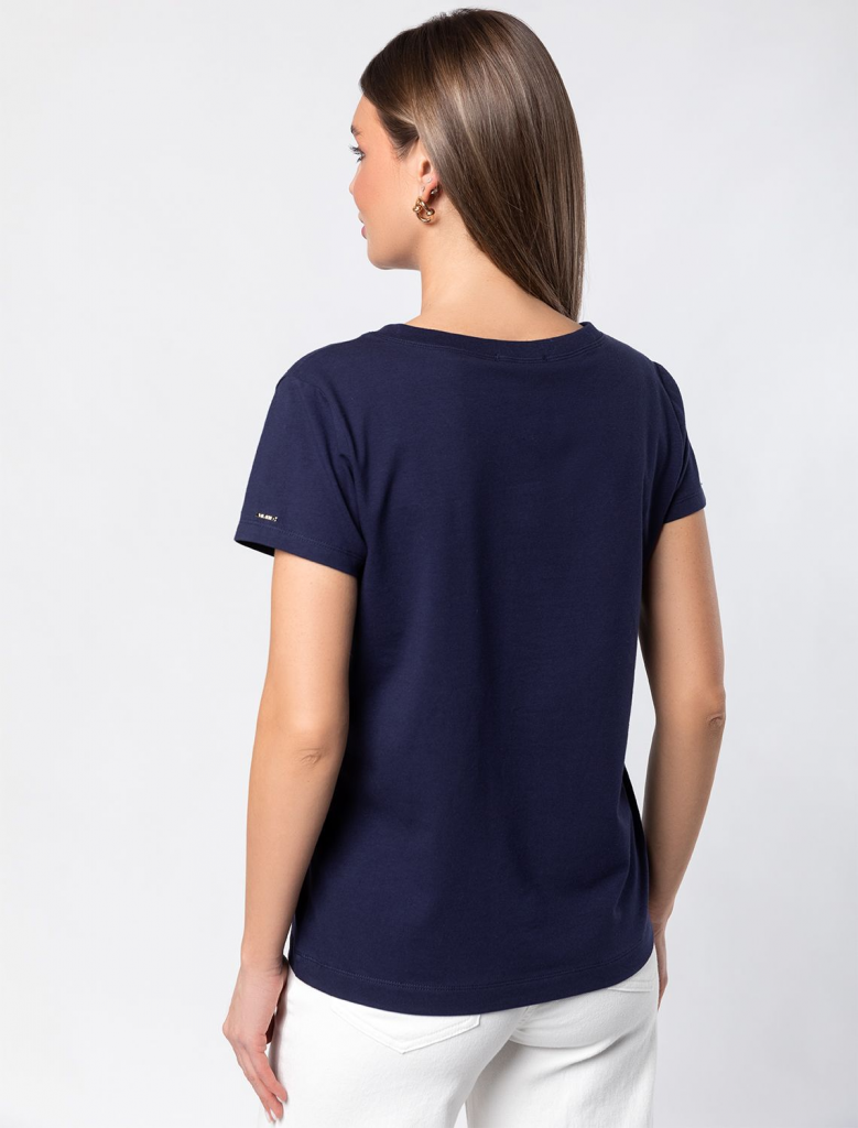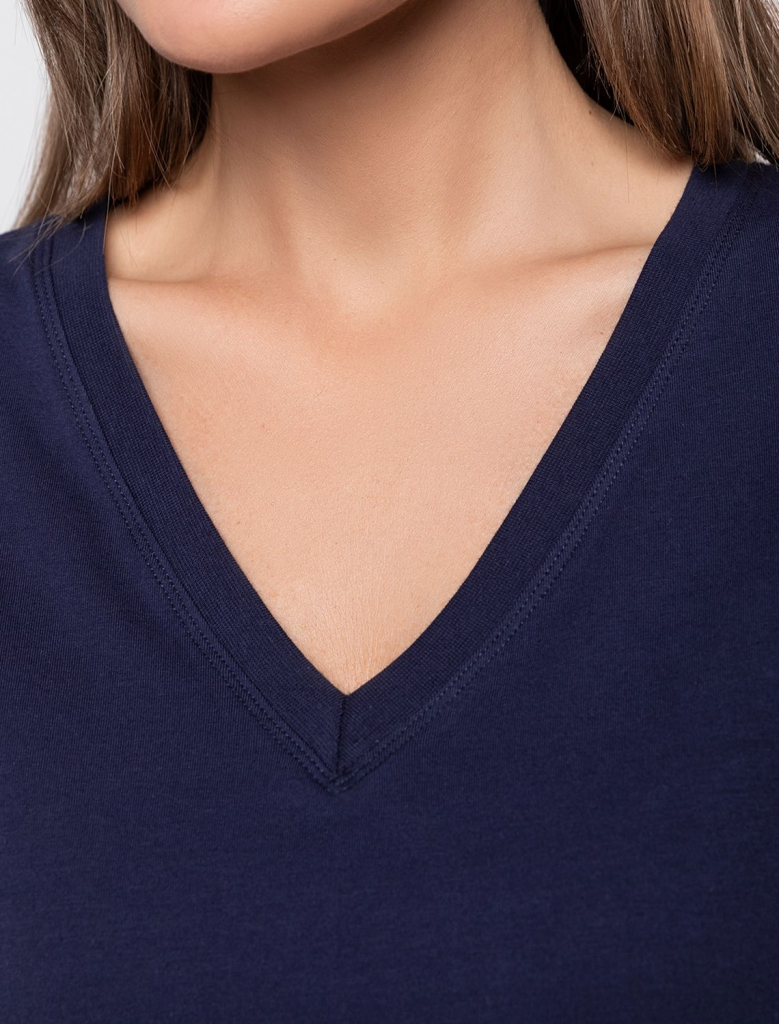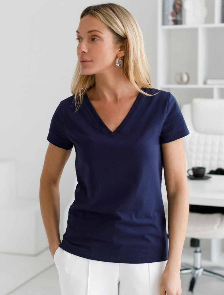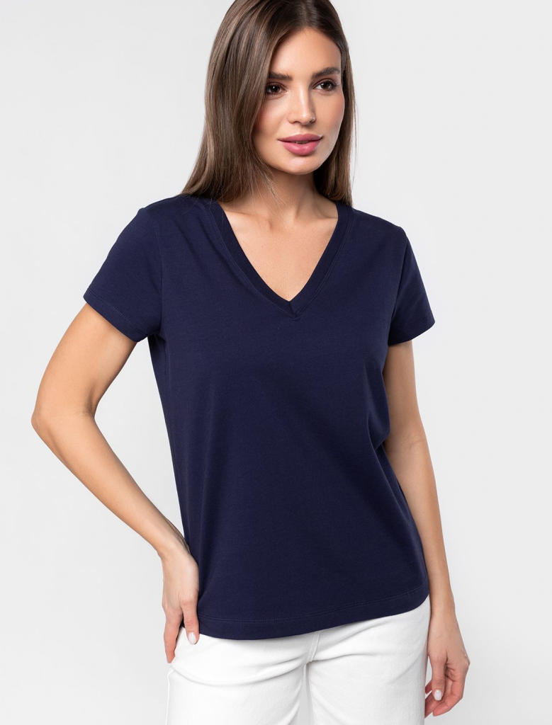 Однотонная футболка с V-образным вырезом выполнена из премиального хлопка. Добавление эластана в состав изделия способствует формоустойчивости. Самое высокое качество длинноволокнистых хлопковых волокон обеспечивает комфорт в любое время года. Совет стилиста: очищенная от декора базовая модель будет уместна не только в повседневном образе с денимом, но и в офисе с нестрогим дресс-кодом, в паре с брюками и жакетом.