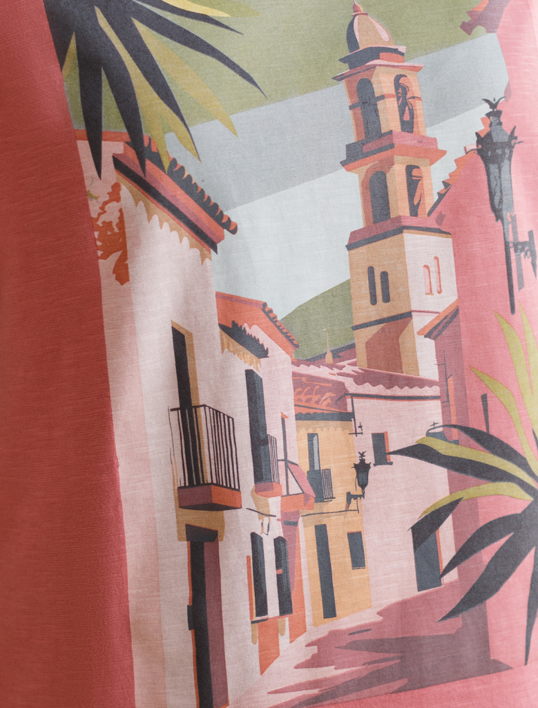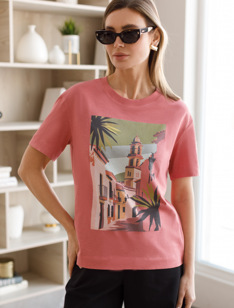 Футболка выполнена из фактурного полотна из 100% хлопка. Модель с авторским принтом легко впишется в любой весенне-летний гардероб. Ткань имеет характерный рисунок черточки за счет сочетания разных волокон хлопка 140-150 г. Хорошо держит форму и поддерживает комфортный микроклимат в течении дня.