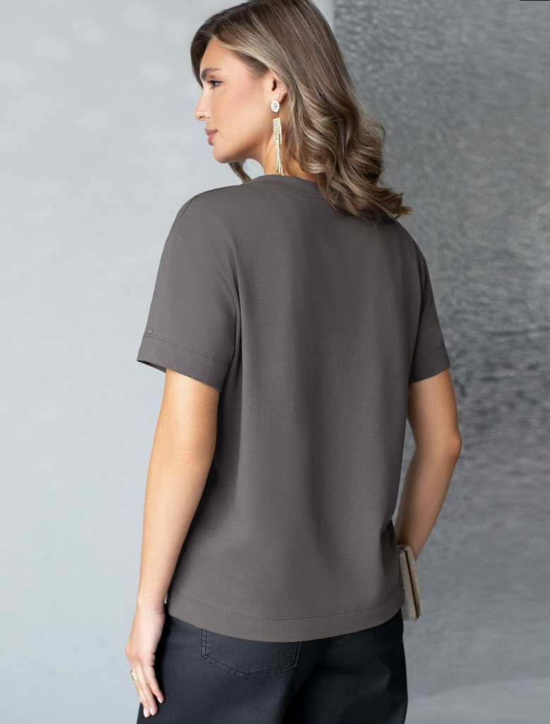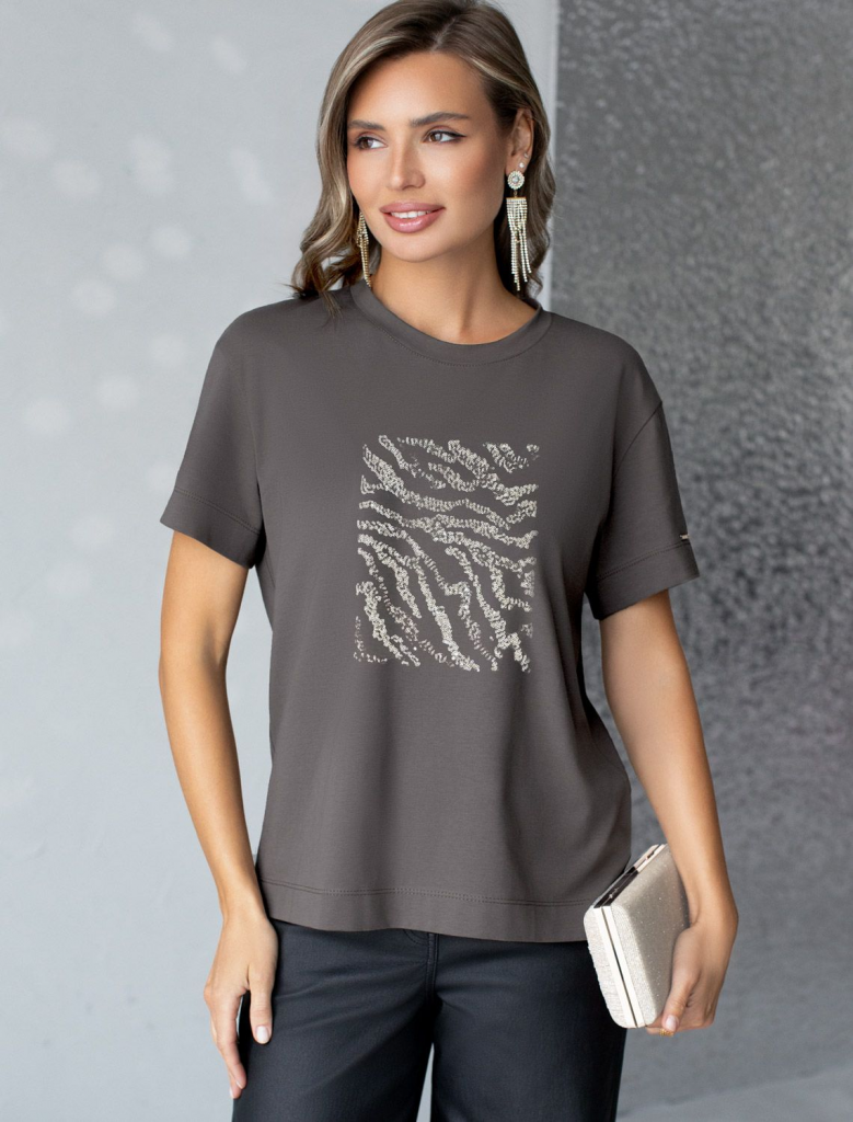 Стильная базовая футболка темно-серого цвета с серебристым принтом пайетками выполнена из плотного хлопка с эластаном для комфортной посадки на любую фигуру. Прямая футболка классического кроя с круглым вырезом, прекрасно подходит для разных типов фигуры, в том числе и на большие размеры. Мягкость хлопка вместе с небольшой долей эластана гарантирует идеальную посадку и свободу движений. Легкая натуральная дышащая ткань премиального качества делает футболку с коротким рукавом идеальным вариантом для повседневной носки дома, на работу или офис. Однотонная футболка дополнена авторским аккуратным принтом зебра, который придает праздничный и элегантный вид без лишней вычурности. Блестящий анималистичный принт аккуратно украшает, добавляя изысканный акцент и создавая легкий мерцающий эффект. Эта эффектная футболка станет отличным выбором на праздник, подчеркивая образ сияющей и уверенной в себе девушки или женщины. Если вы ищете комфортный и одновременно привлекательный наряд для особых моментов, эта футболка с