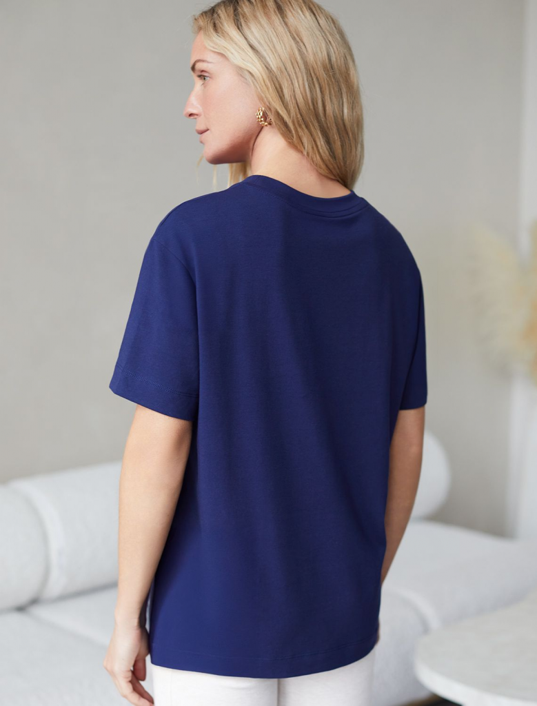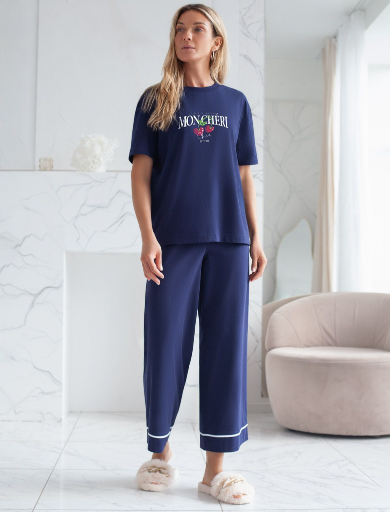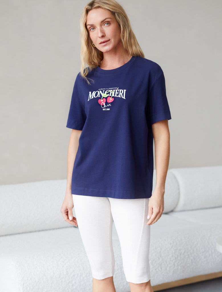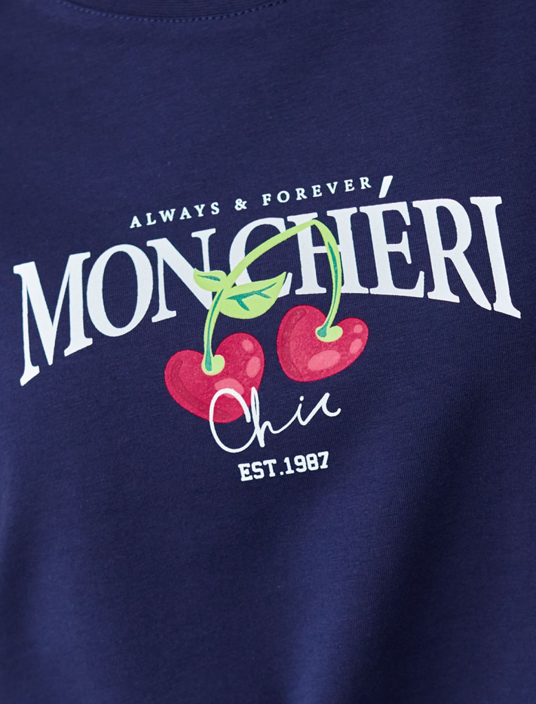 Футболка темно-синего цвета изготовлена из премиального хлопка с эластаном, она обеспечивает невероятное ощущение уюта и легкости. Натуральный материал сохраняет форму и цвет после множества стирок, обеспечивая долговечность изделия, а его высокая воздухопроницаемость создает ощущение свежести даже в течение долгого дня. Особое внимание привлекает стильный принт в виде ягод вишни с минималистичной надписью. Перевод надписи: Always and Forever Moncheri - Всегда и Навсегда Мончери. Принт выполнен красками с устойчивым покрытием, который добавляет изделию оригинальности и позволяет выразить индивидуальность. Свободный крой футболки дарит удобство и не стесняет движений, что делает ее идеальной для повседневной носки или активного отдыха, подчеркивает современный взгляд на моду. На рукаве металлический логотип бренда. Подойдет девушкам и женщинам на любую фигуру, вы будете чувствовать себя в ней уверенно и комфортно. Отлично впишется в гардероб благодаря универсальному дизайну, который легко сочетать с джинса