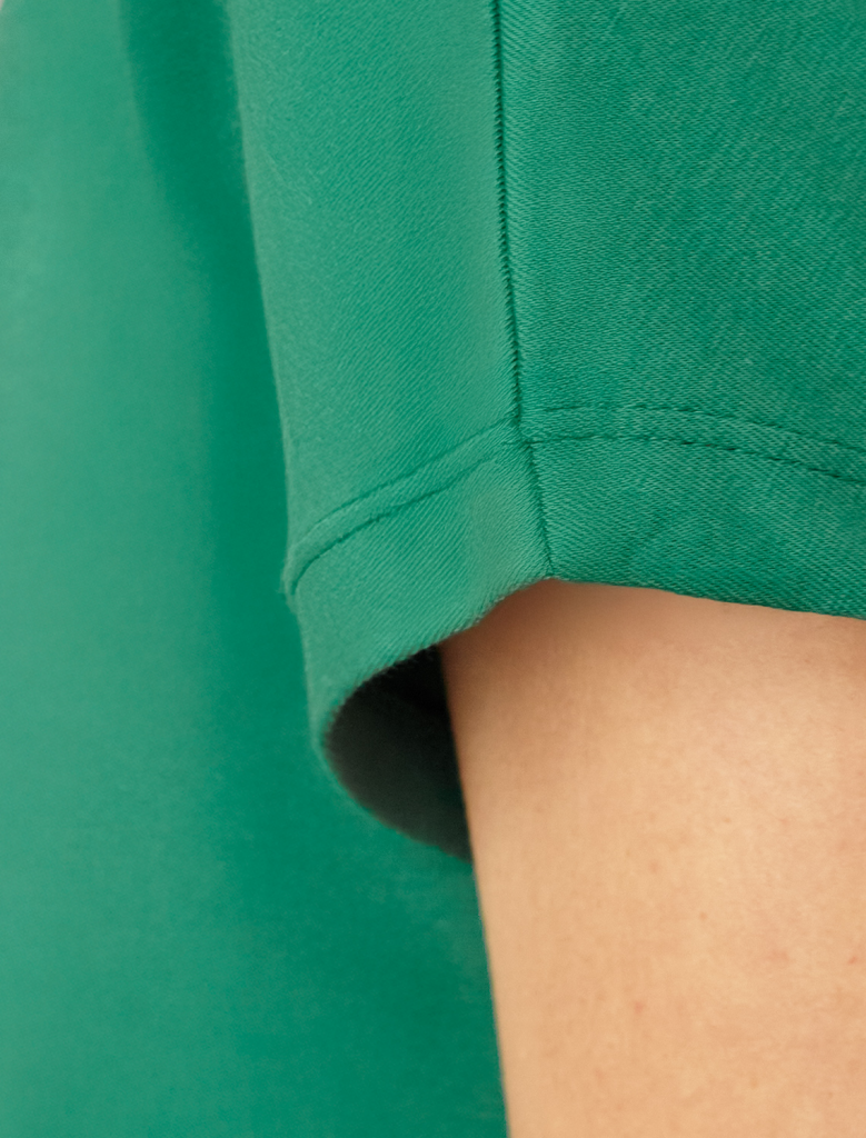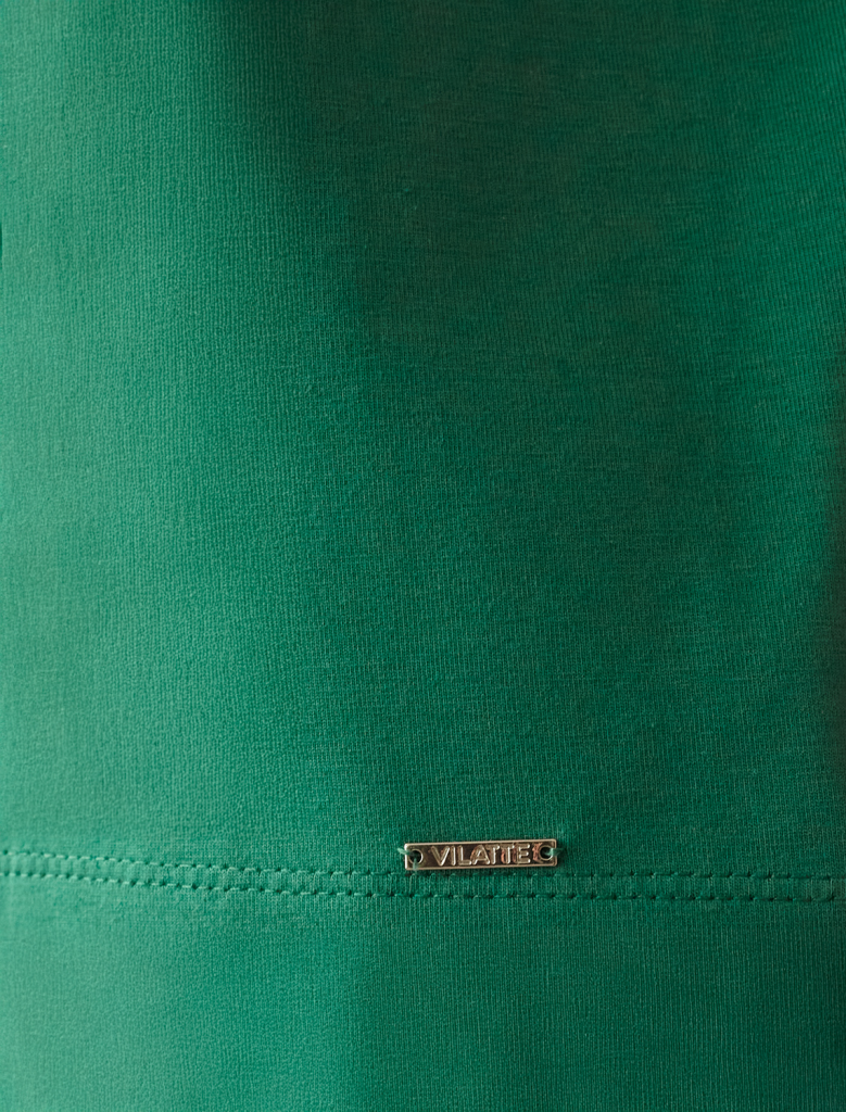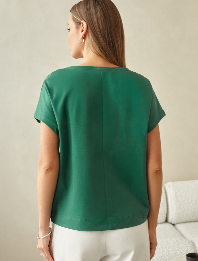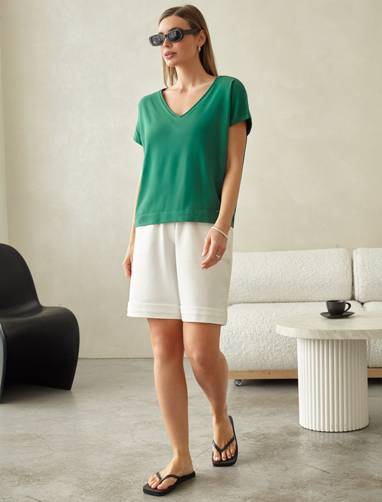 Футболка с цельнокроеным рукавом выполнена из премиального хлопка. Базовая однотонная модель идеально впишется в любой гардероб. V-вырез подчеркивает ключицы и удлиняет шею, хорошо сочетается с жакетами или кардиганами. Изделие дополнено металлическим логотипом бренда.