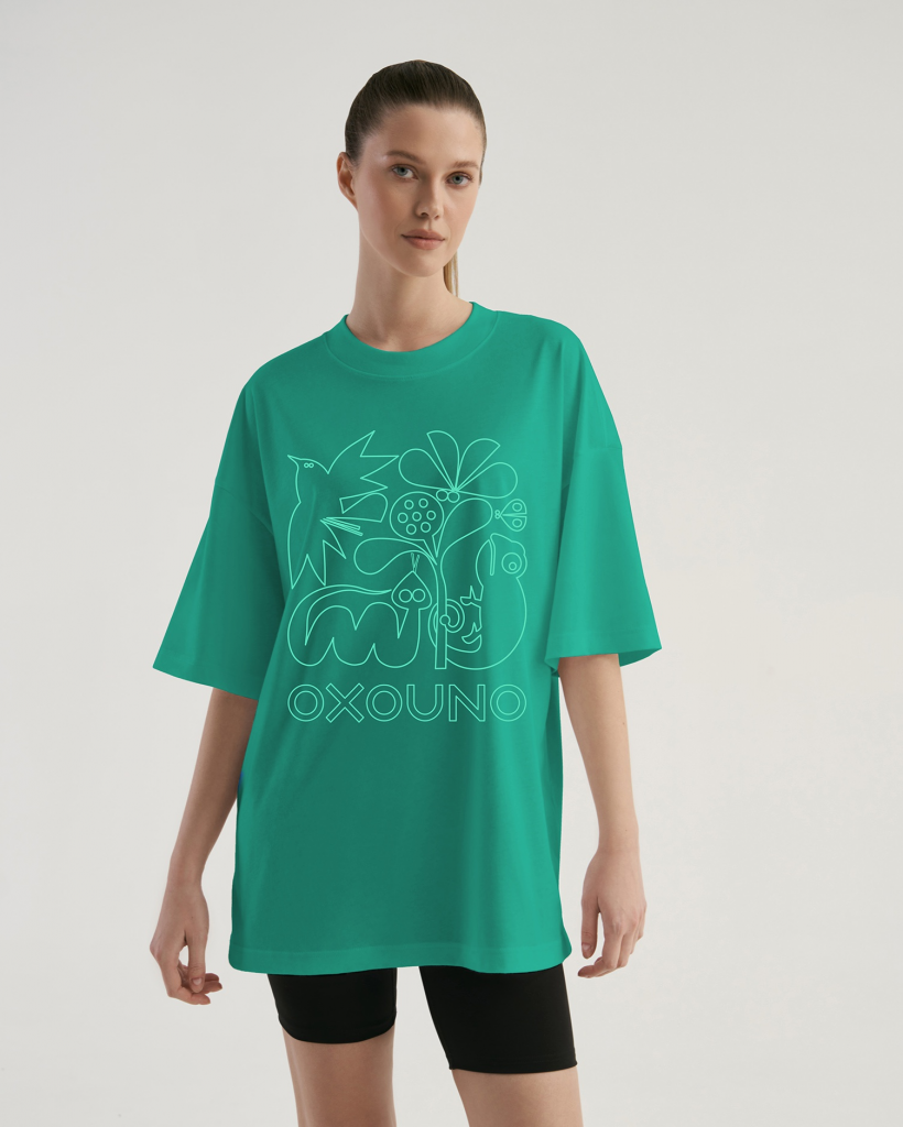 Футболка свободного силуэта. Спущенное плечо. Горловина из двух деталей, из рибаны.