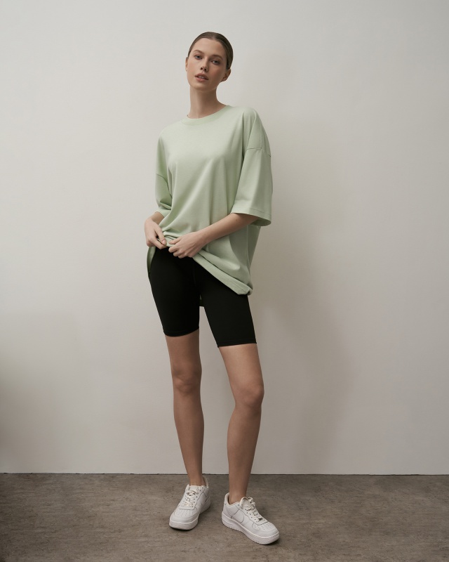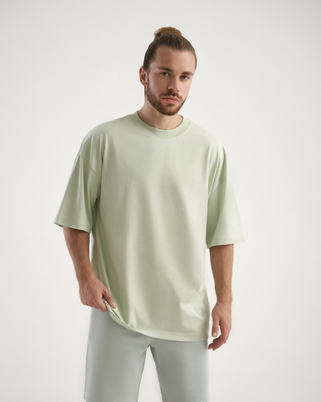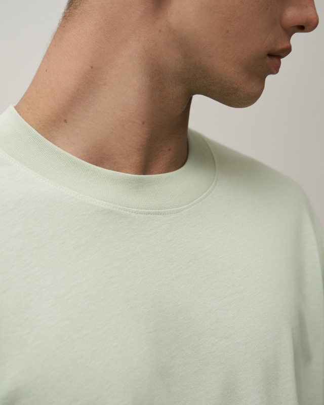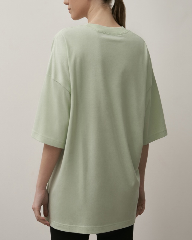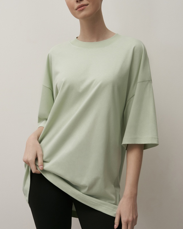 Футболка свободного силуэта. Спущенное плечо. Горловина из двух деталей, из рибаны.