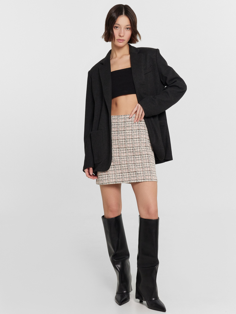 Юбка прямая, длина мини. Верхний срез обработан обтачкой из основного полотна. На задней детали застрочены вытачки. В боковом шве обработана застежка на потайную молнию. Нижний срез обработан швом вподгибку.