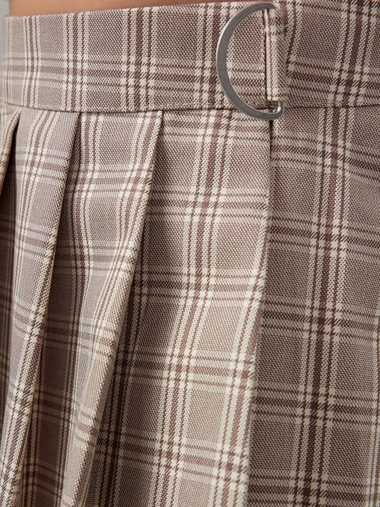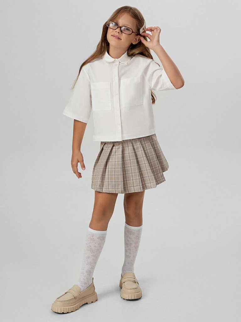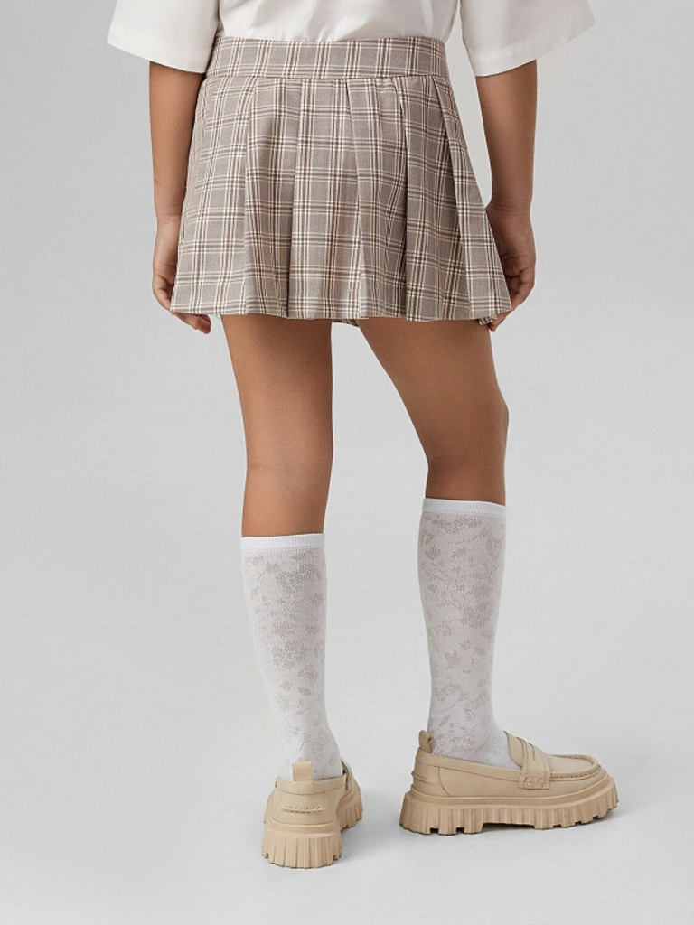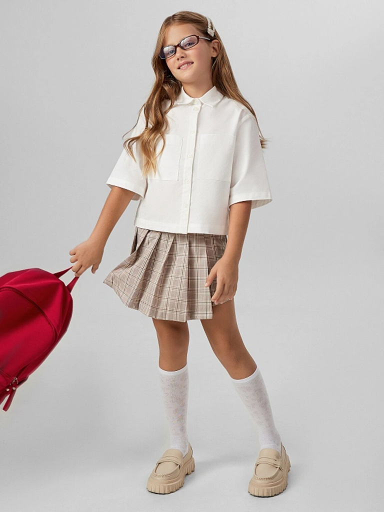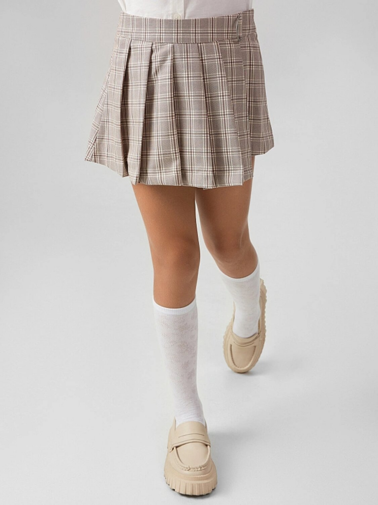 Стильная юбка для девочек бежевого цвета с принтом в коричневую клетку станет отличным выбором для школьного гардероба.