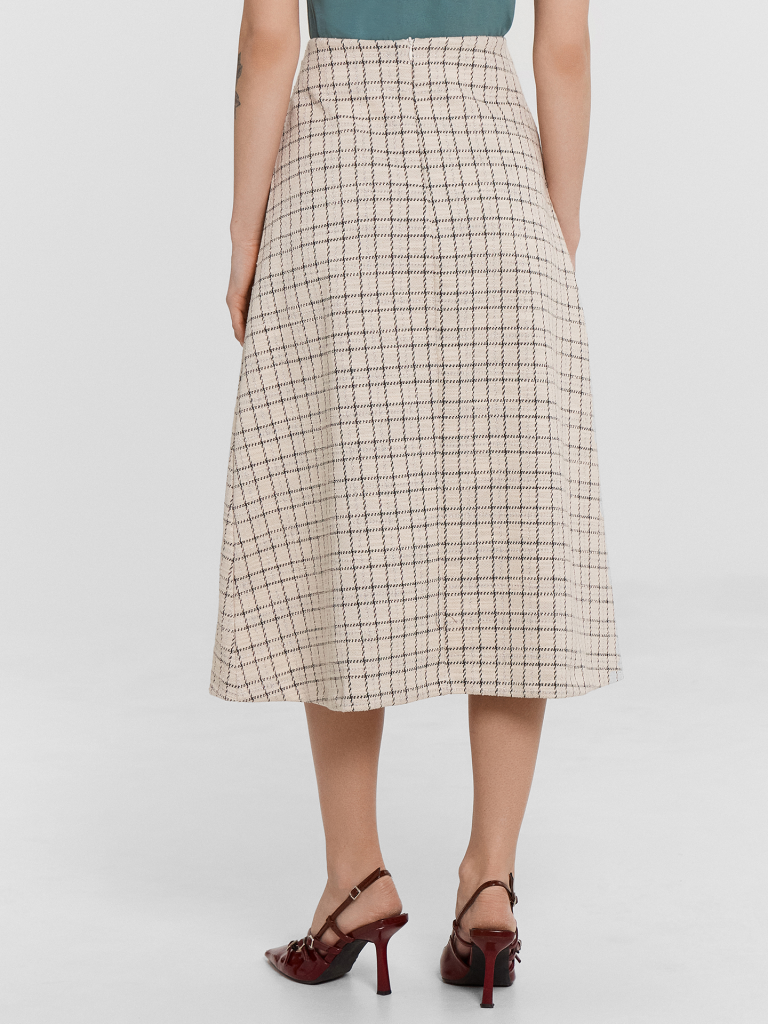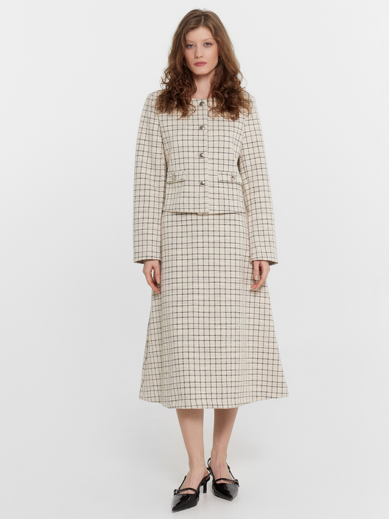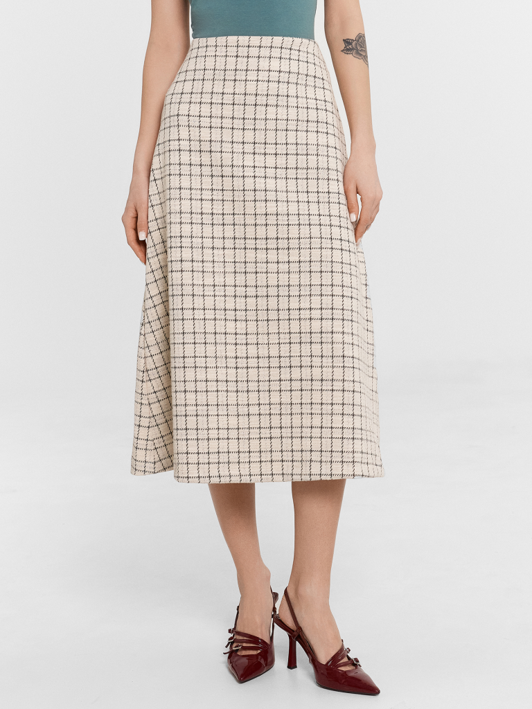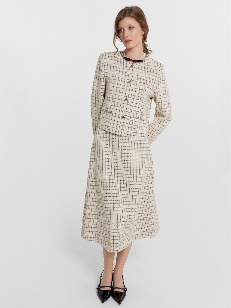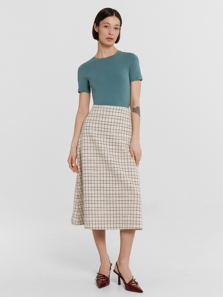 Полотно трикотажное академик (шанель)Юбка изготовлена из трикотажного полотна. Юбка А-силуэта, длиной миди. Верхний срез обработан обтачкой из основного полотна. Задняя часть юбки со средним швом и застежкой на потайную молнию. Нижний срез обработан швом вподгибку.