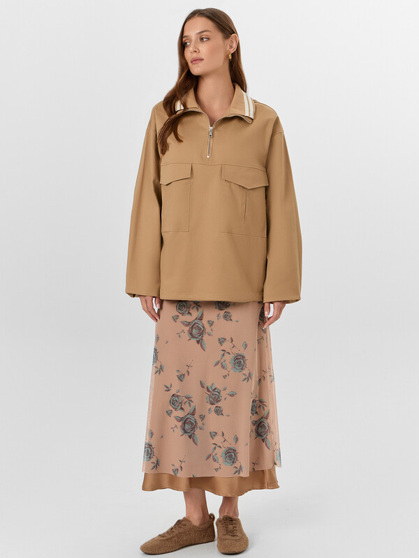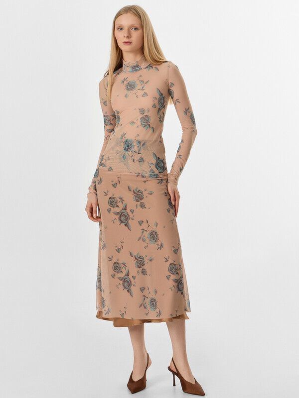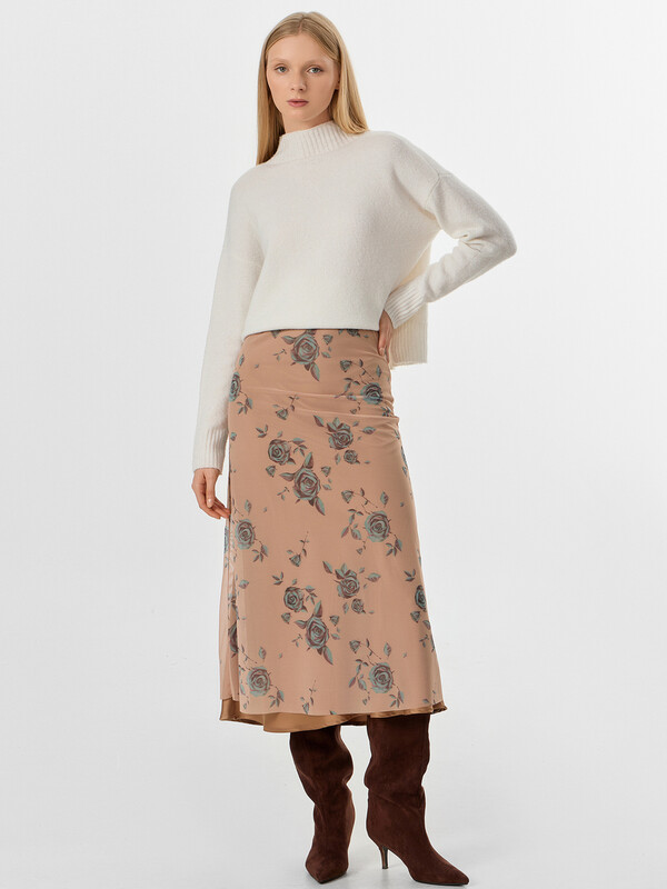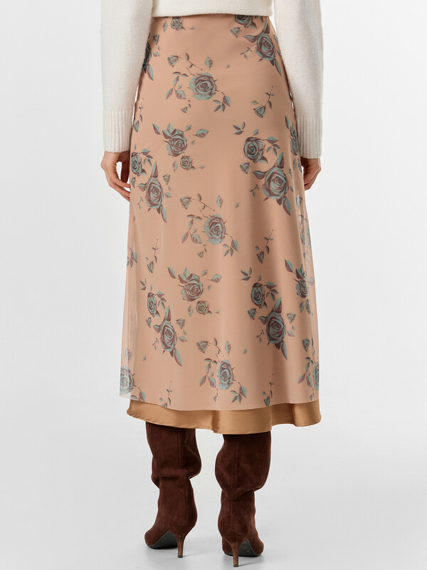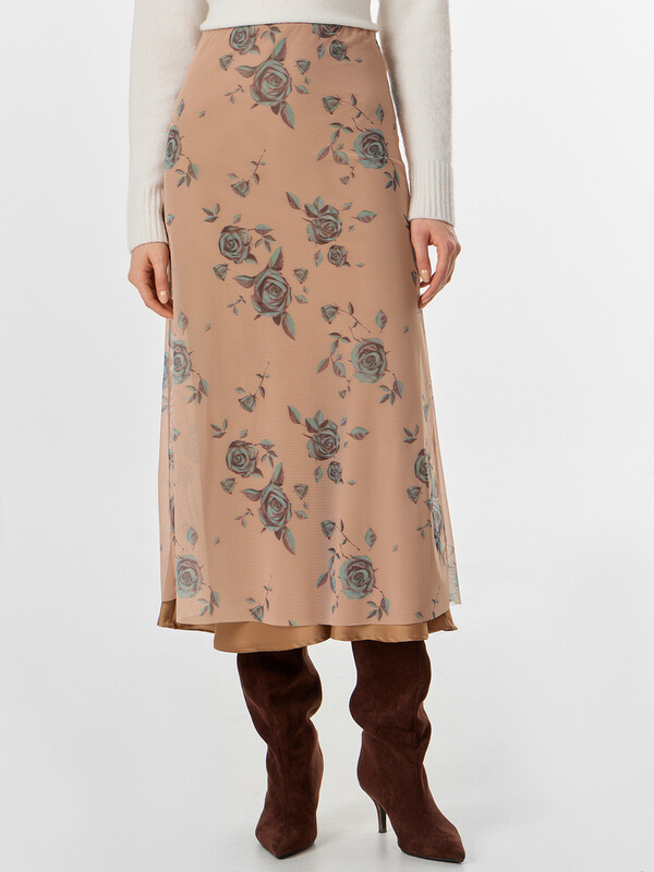 Юбка А-силуэта длиной миди, двухслойная. Верхний слой из сетки, нижняя юбка из ткани (крой по косой). По верхнему срезу притачана эластичная тесьма (внутр. 20мм 20RV). Нижний срез верхней юбки с "сырым срезом". Нижний срез нижней юбки обработан швом вподгибку.