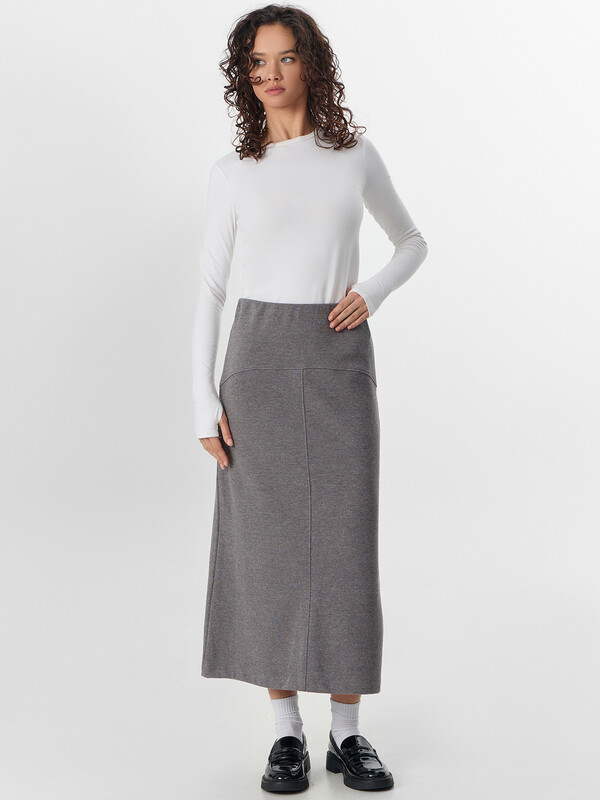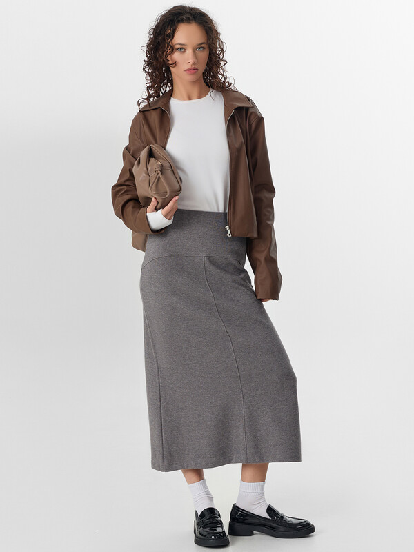 Серая женская юбка А-силуэта — элегантная простота для вашего повседневного гардероба. Плавно расширяющийся книзу силуэт мягко следует за линиями фигуры, создавая утонченный образ. Эластичный пояс бережно облегает талию, даря комфорт в течение всего дня.