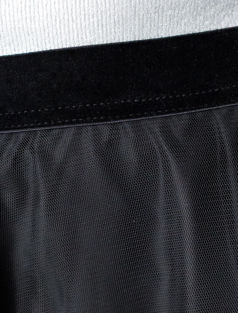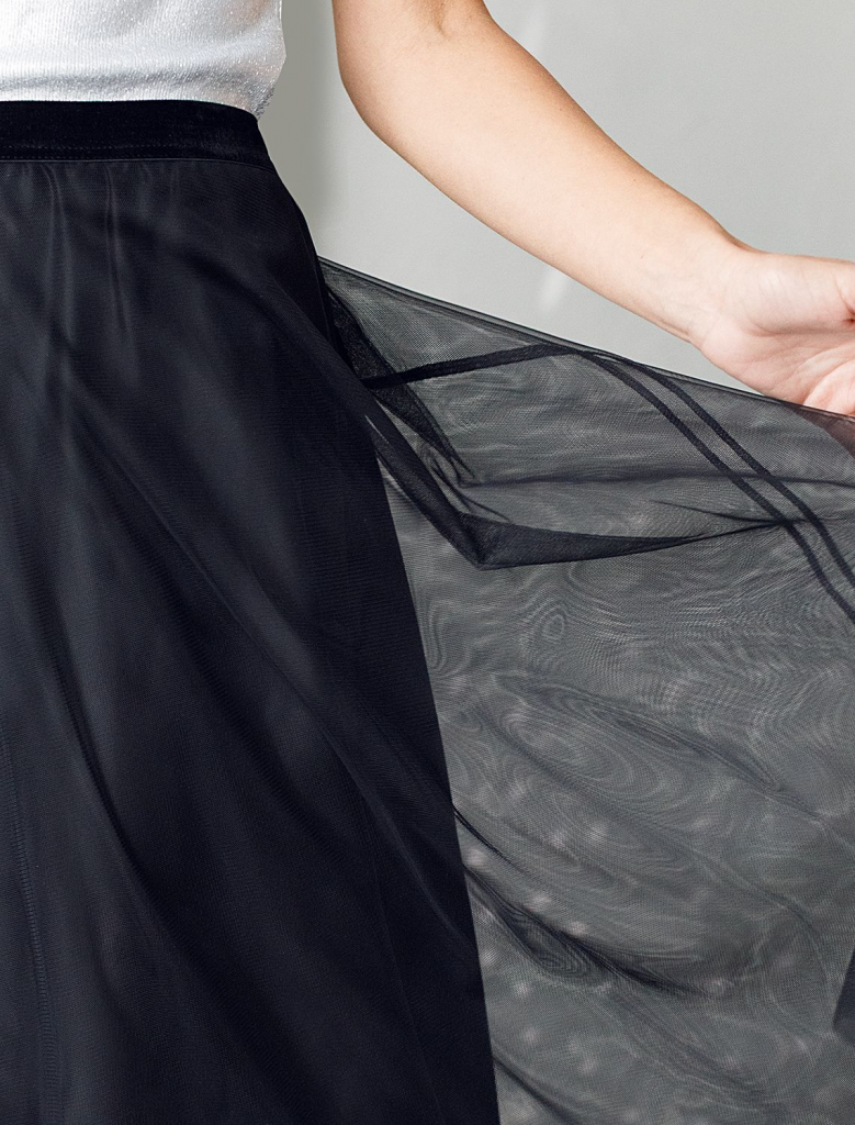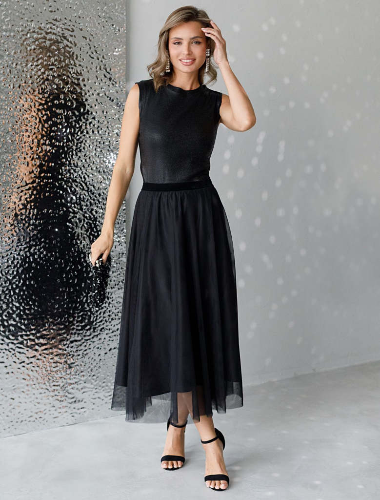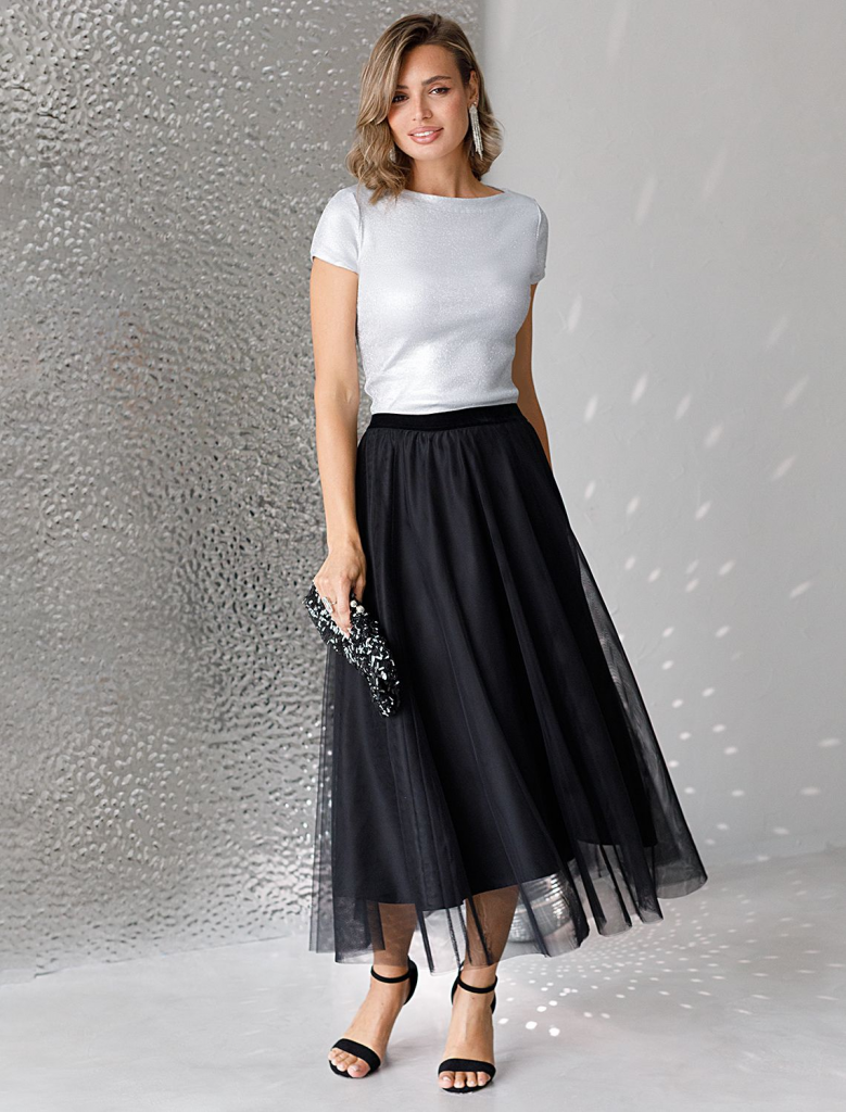 Воздушная юбка миди черного цвета из матового сатина с мягкой сеткой — отличный выбор для особого случая или торжества. Легкая и эффектная, она шикарно подчеркивает силуэт благодаря расклешенной форме трапеция. Мягкая сетка добавляет изящества и облегчает образ, а широкий эластичный пояс обеспечивает комфорт в течение всего дня. Длинная юбка подойдет и для высоких, и для девушек низкого роста.Благодаря продуманному крою изделие отлично сохраняет форму в течение всего времени носки.Нарядная юбка трапеция идеально подходит для создания новогоднего образа, для корпоративного мероприятия, так и на вечеринку с друзьями. В меру пышная расклешенная форма позволяет сочетать ее с разными вариантами верха, делая ансамбль женственным и стильным. Большой размерный ряд дает возможность выбрать подходящий вариант для любого типа фигуры, включая маленькие и большие размеры. Стильная юбка А силуэта легко вписывается не только в гардероб для торжественных мероприятий, но и подходит для повседневного выхода в город благодаря