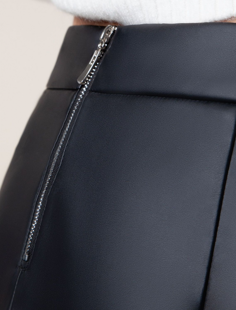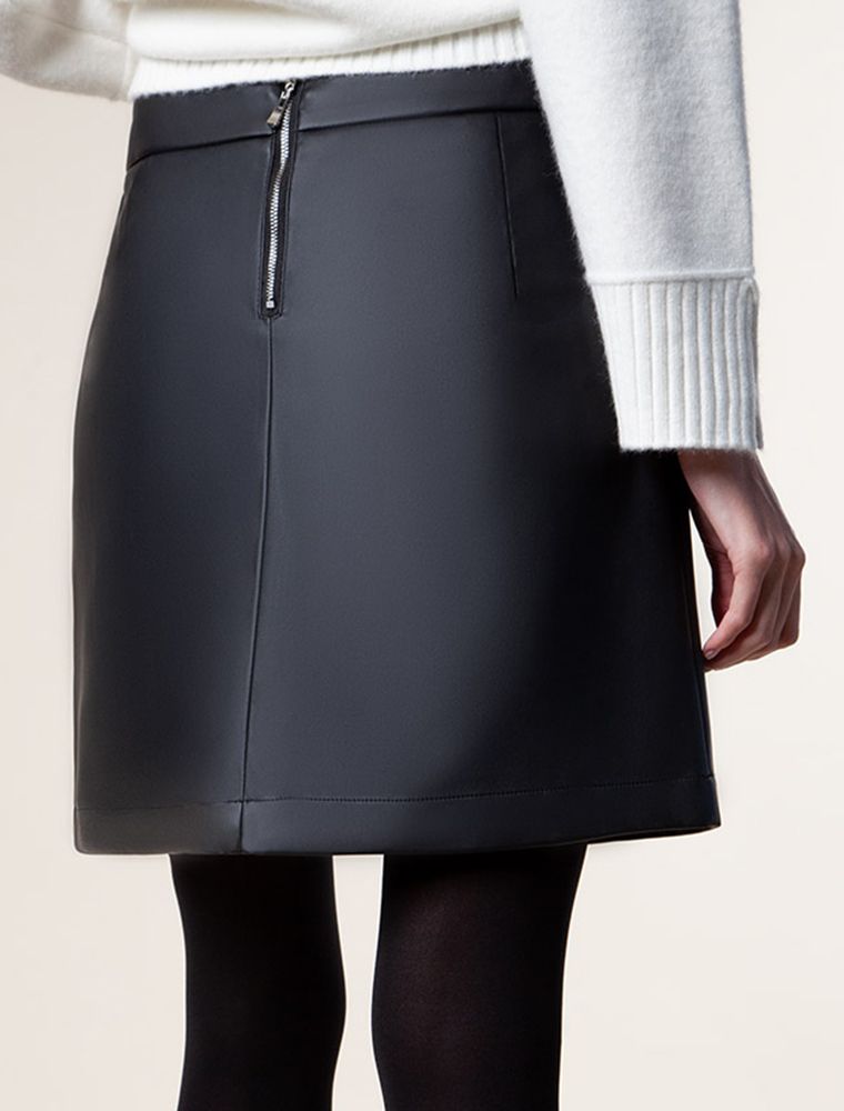 Мини-юбка выполнена из эластичной эко-кожи в черном цвете с матовым эффектом. Модель без карманов, с застежкой на молнию серебристого цвета, хорошее решение для праздничного выхода. Атласное внутреннее покрытие обеспечивает идеальный комфорт при носке с колготками. В повседневной жизни отлично дружит с вязаными джемперами.