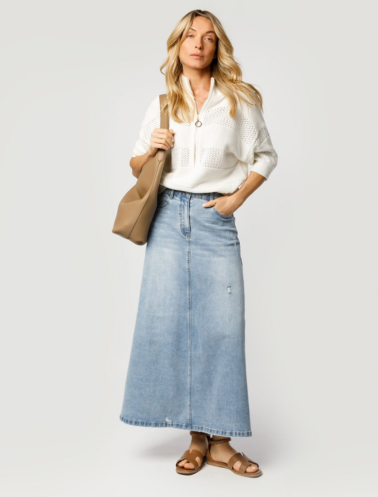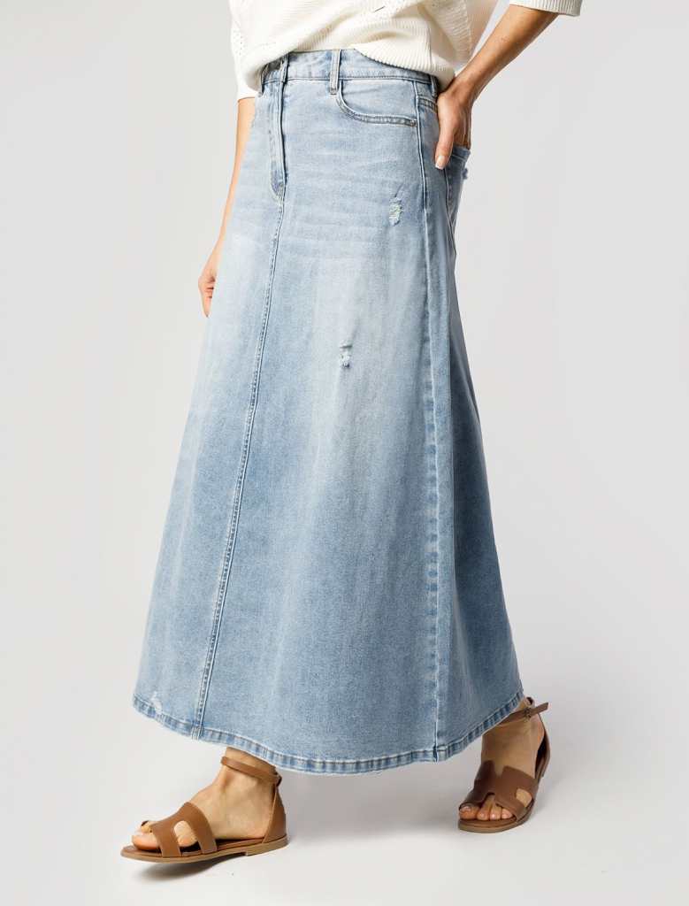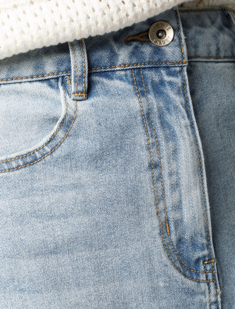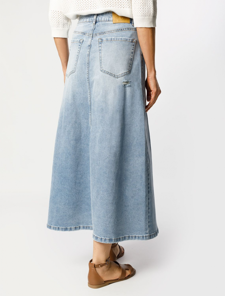 Юбка А-силуэта в голубом оттенке выполнена из эластичного денима. Модель с эффектной стиркой и декоративными рваными элементами дополнена пятью карманами как у джинс и брендированным патчем. Свободная модель с посадкой на талии подчеркивает достоинства и подходит для любого типа фигуры.