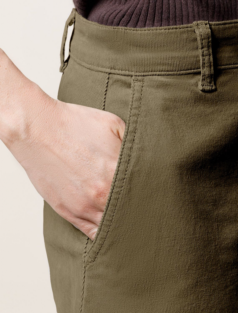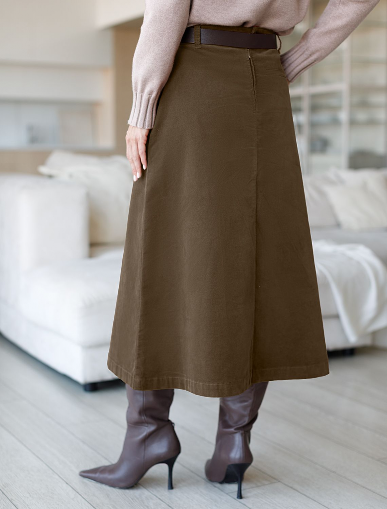 Юбка-миди трапециевидного силуэта выполнена из мягкого хлопкового микро-вельвета с добавлением эластана. Изделие комфортно садится по фигуре и не сковывает движения. Модель дополнена высококачественной фурнитурой с фирменным логотипом бренда. Хорошо комбинируется с вязаным трикотажем, блузками и денимом.Также прекрасно станет альтернативой деловым низам в нестрогом офисном дресс-коде.