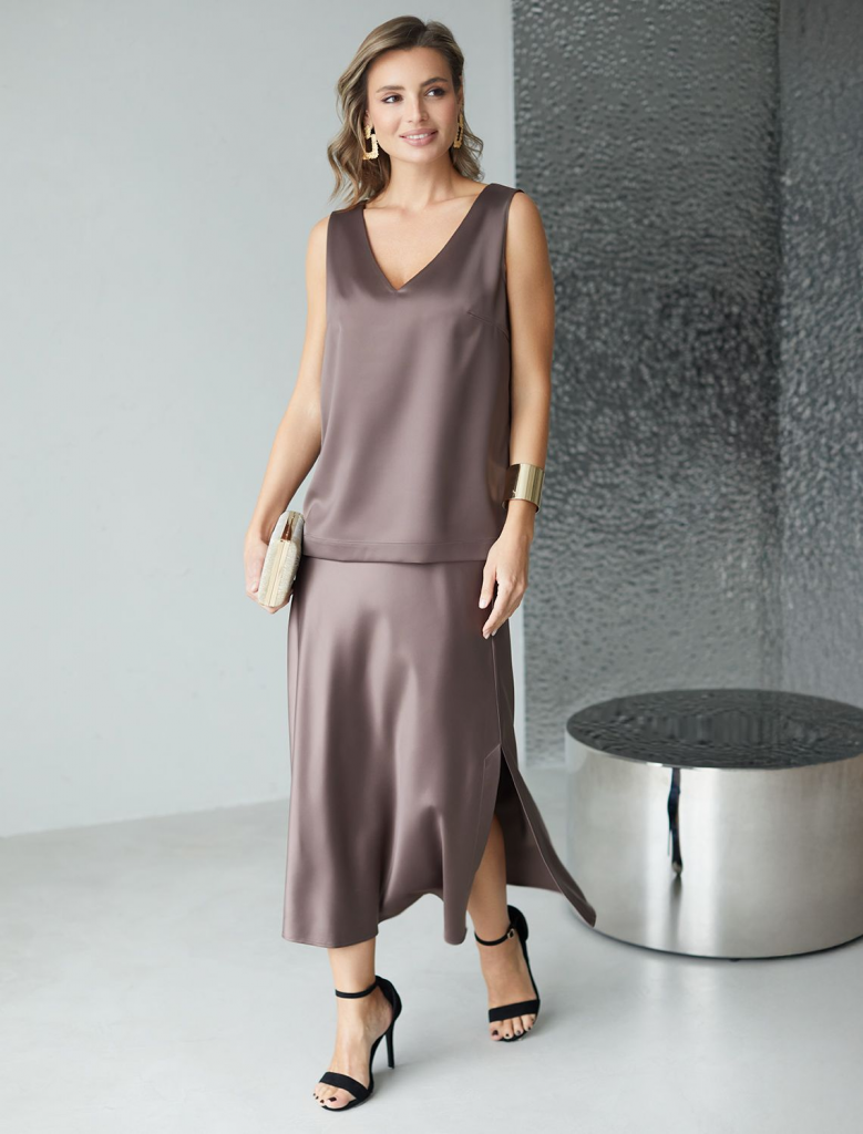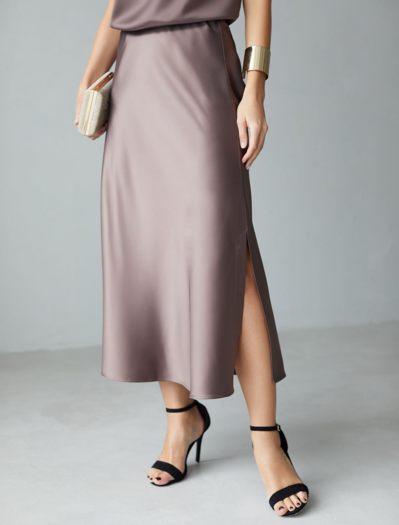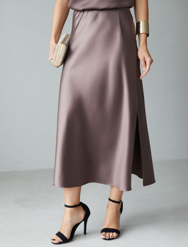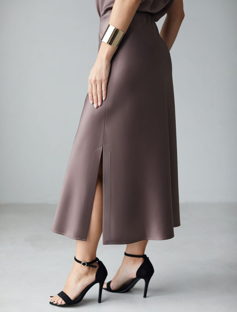 Юбка миди кофейного цвета с разрезом из струящегося плотного сатина — находка для модниц, ценящих элегантную классику и современный стиль. Модный крой длинной юбки подчеркивает фигуру, а мягкий эластичный пояс обеспечивает дополнительный комфорт на протяжении всего дня. Благодаря продуманному крою, юбка хорошо сидит на фигуре и подчеркивает силуэт без лишних деталей, подойдет для обладательниц пышных форм и девушек маленьких размеров. Шелковистая текстура материала приятно ощущается на коже, не просвечивает и сохраняет форму даже после длительной носки. Гладкая поверхность добавляет благородного блеска, делая образ неповторимым и шикарным в любой ситуации. Струящийся плотный сатин отличается устойчивостью к сминанию: юбка не мнется, что позволяет выглядеть безупречно на работе, встрече или прогулке. Атласная юбка придает образу элегантный и благородный вид, а разрез добавляет легкую динамичность и создает утонченный акцент на линии ног, сохраняя при этом сдержанную женственность. Юбка визуально вытягивает си