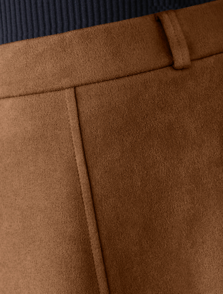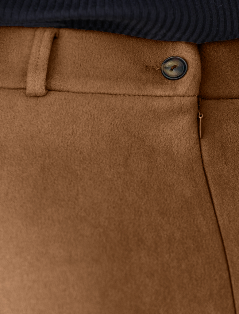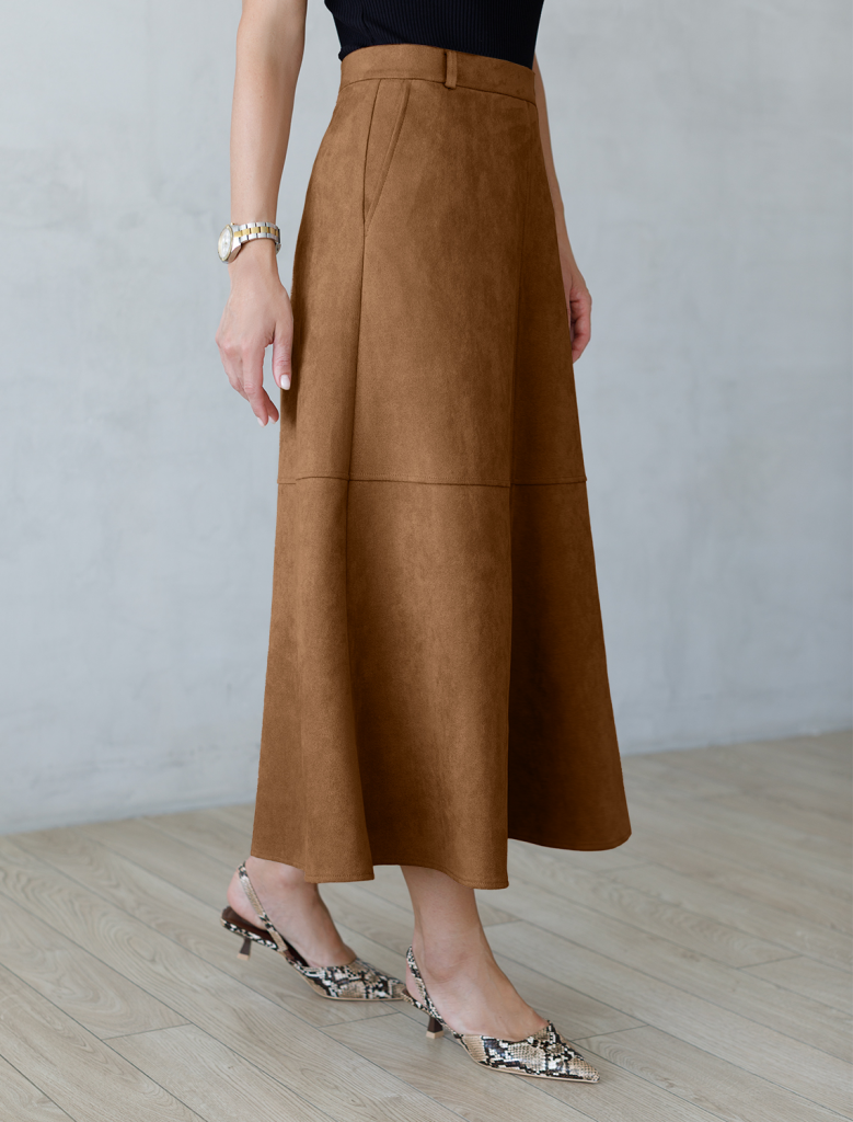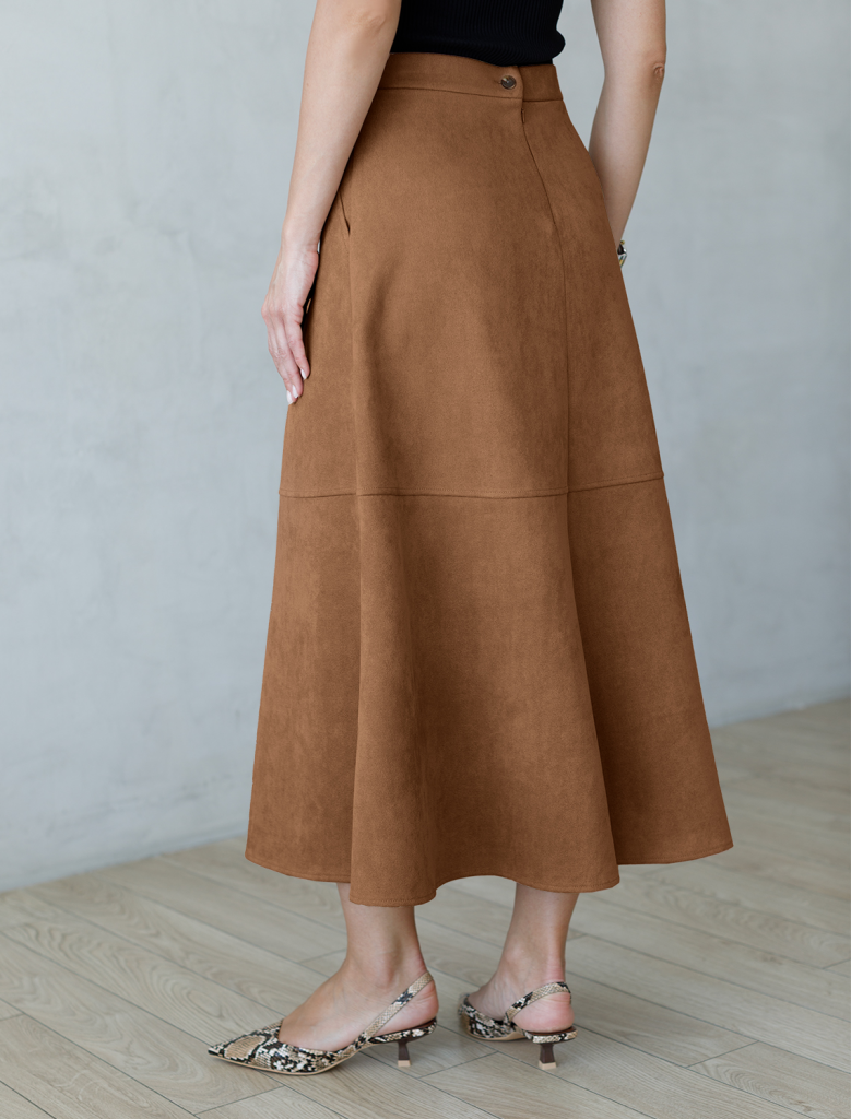 Юбка А-силуэта выполнена из мягкой искусственной замши. Элегантная форма трапеции с четырьмя клиньями отлично впишется в любой повседневный образ, добавляя изюминку и стиль. Мягкий материал в точности имитирует натуральную замшу, но в уходе и носке более практичный. Внутренняя сторона изделия без подклада, гладкая и приятная к телу. Юбка легко комбинируются с любыми блузками, лонгсливами, свитерами и водолазками.