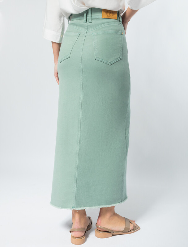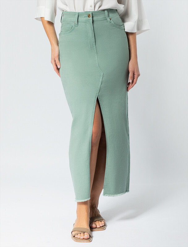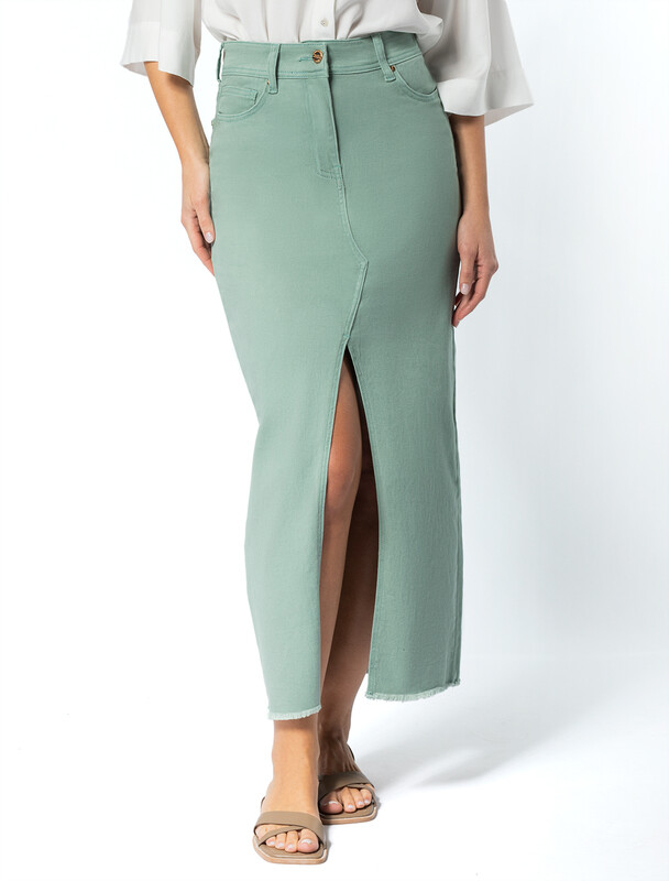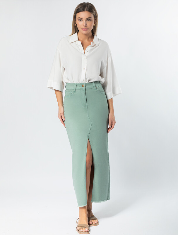 Юбка выполнена из суперэластичного денима. Трендовая модель с разрезом спереди и необработанным краем выгодно подчеркивает изгибы тела и подходит для любой фигуры. Материал отлично держит форму, не вытягивается и сохраняет свой безупречный вид в течении долгого времени. Сочетайте в костюме total-denim с курткой-жакетом D51.013 и курткой-рубашкой D59.009