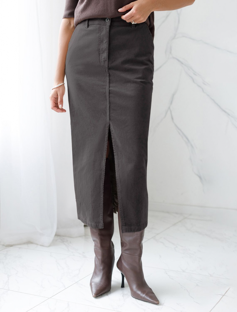 Юбка прямого кроя с выполнена из мягкого хлопкового микро-вельвета с добавлением эластана. Модель дополнена высоким разрезом спереди. Изделие комфортно садится по фигуре и не сковывает движения. Хорошо комбинируется с вязаным трикотажем, блузками и денимом. Также прекрасно станет альтернативой деловым низам в нестрогом офисном дресс-коде.