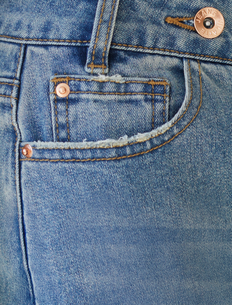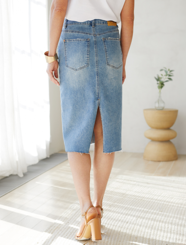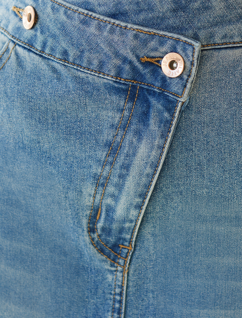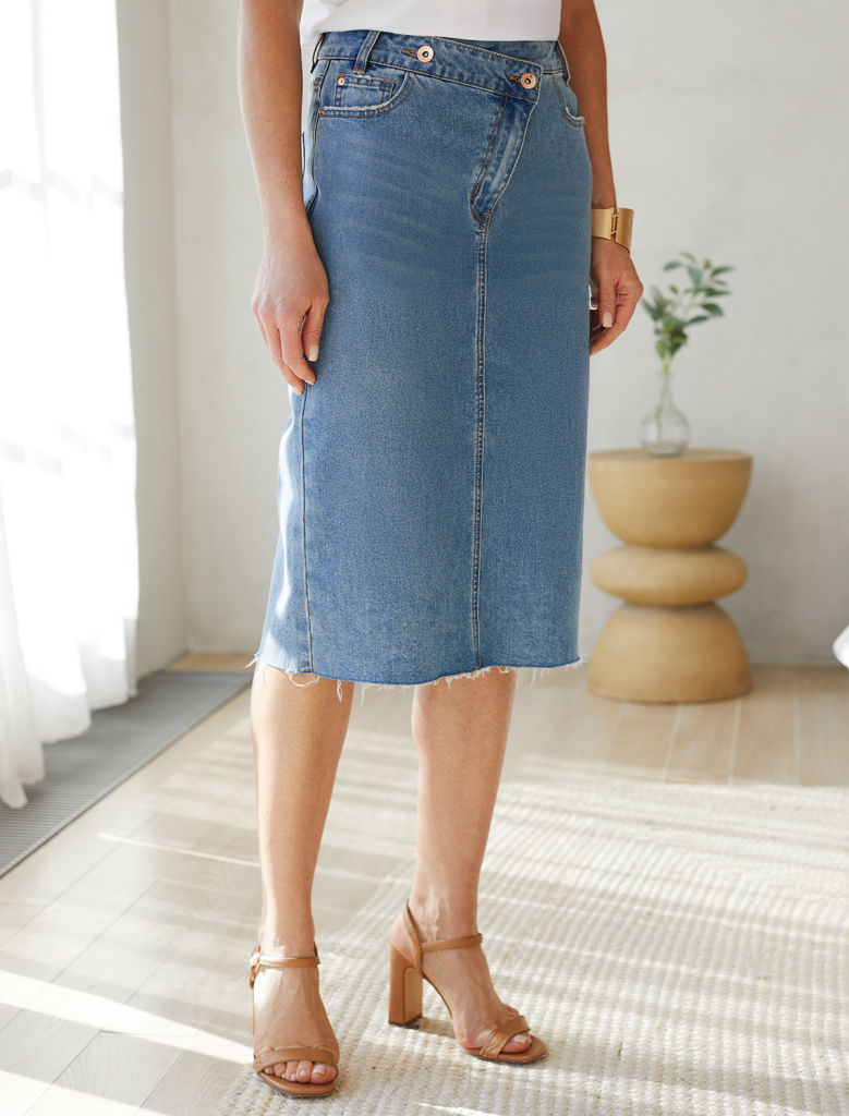 Юбка выполнена из эластичного денима. Модель с трендовой ассиметричной застежкой и декоративной стиркой дополнена краем с открытым срезом и потертостями. Изделие прямого кроя длиной чуть ниже колен с разрезом сзади дополнено брендированным патчем и высококачественной фурнитурой.
