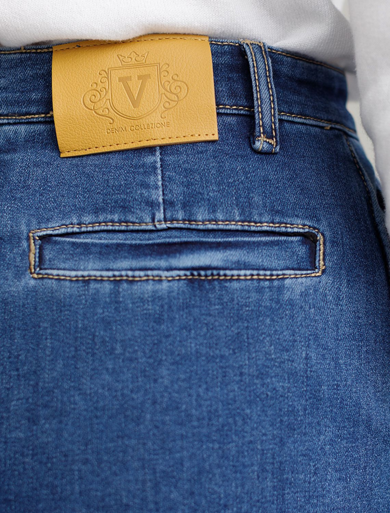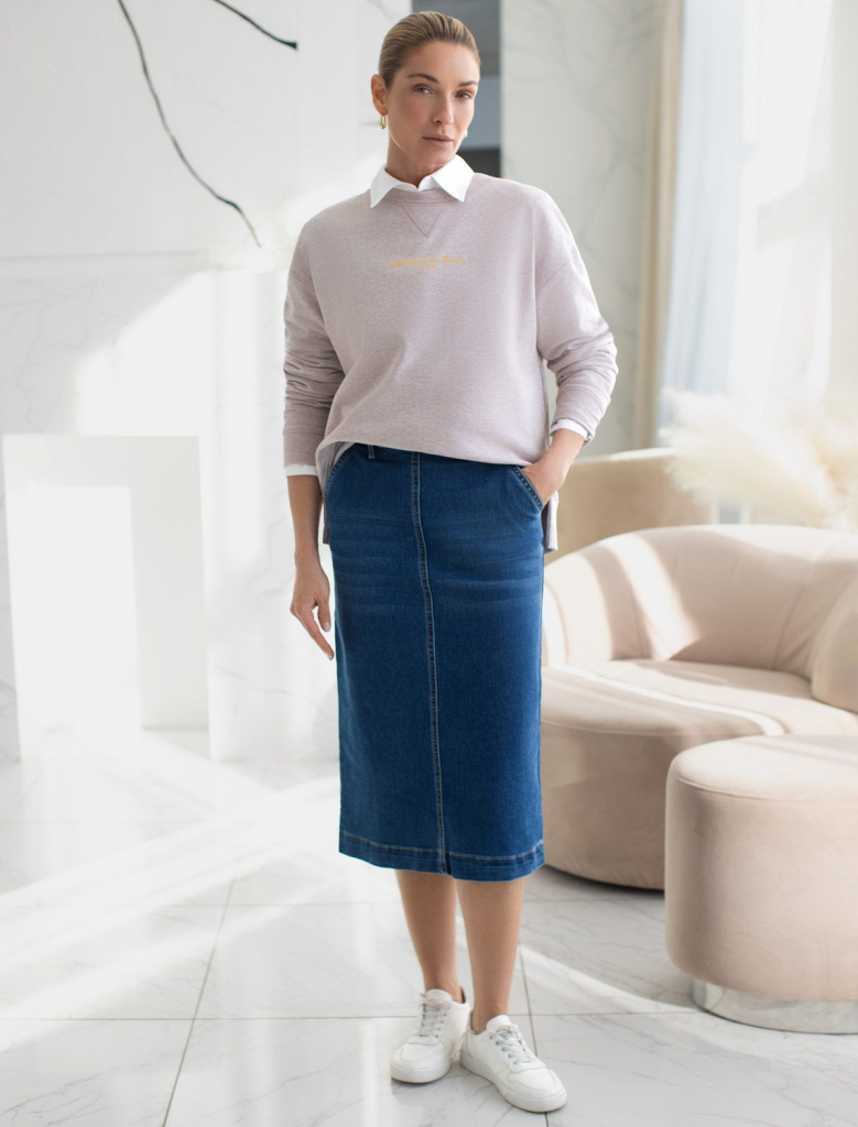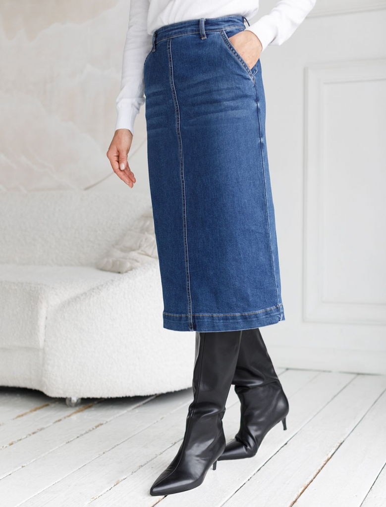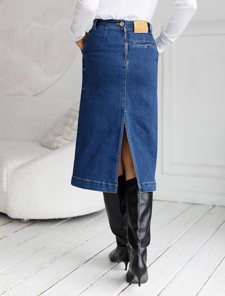 Лаконичная джинсовая юбка красивого синего цвета из эластичного денима идеально подходит для создания женственного образа в любое время года, особенно в осенний период. Прямой фасон с высокой посадкой формирует аккуратный силуэт, подчеркивая достоинства фигуры и обеспечивая комфорт при ходьбе. Контрастные швы, отрезанный гладкий край понизу без подгибки и легкая декоративная стирка добавляют современности образу. Особенностью является разрез , который делает повседневную юбку более динамичной и удобной для прогулок или работы в офисе.Высокая посадка , фасон карандаш и декоративный прямой шов спереди, визуально удлиняют ноги, вытягивают силуэт. Застежка на молнию обеспечивает удобство надевания и надежную фиксацию. У джинсовой юбки предусмотрены два аккуратных боковых кармана и один задний карман – маленькие детали, которые добавляют практичности без лишнего объема. Премиальная фурнитура гарантирует долговечность. На поясе брендированный патч из эко-кожи. Эластичная ткань адаптируется под любую фигуру, подход