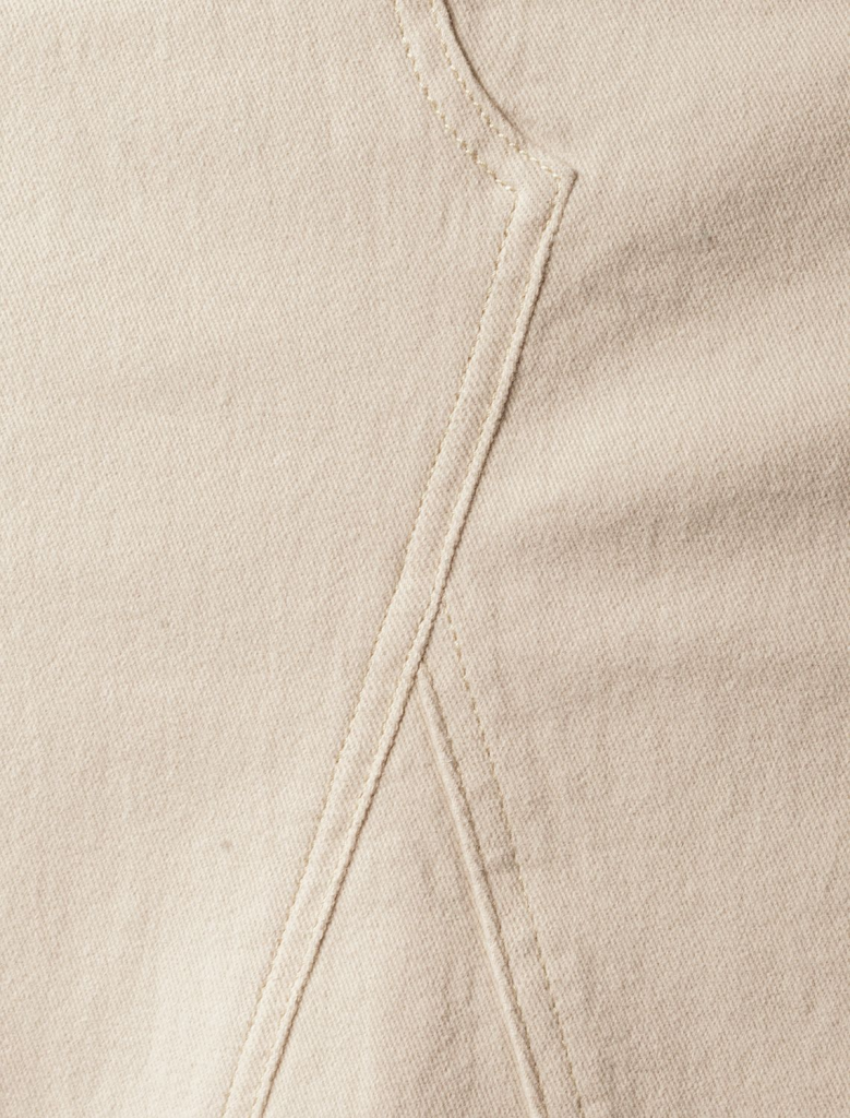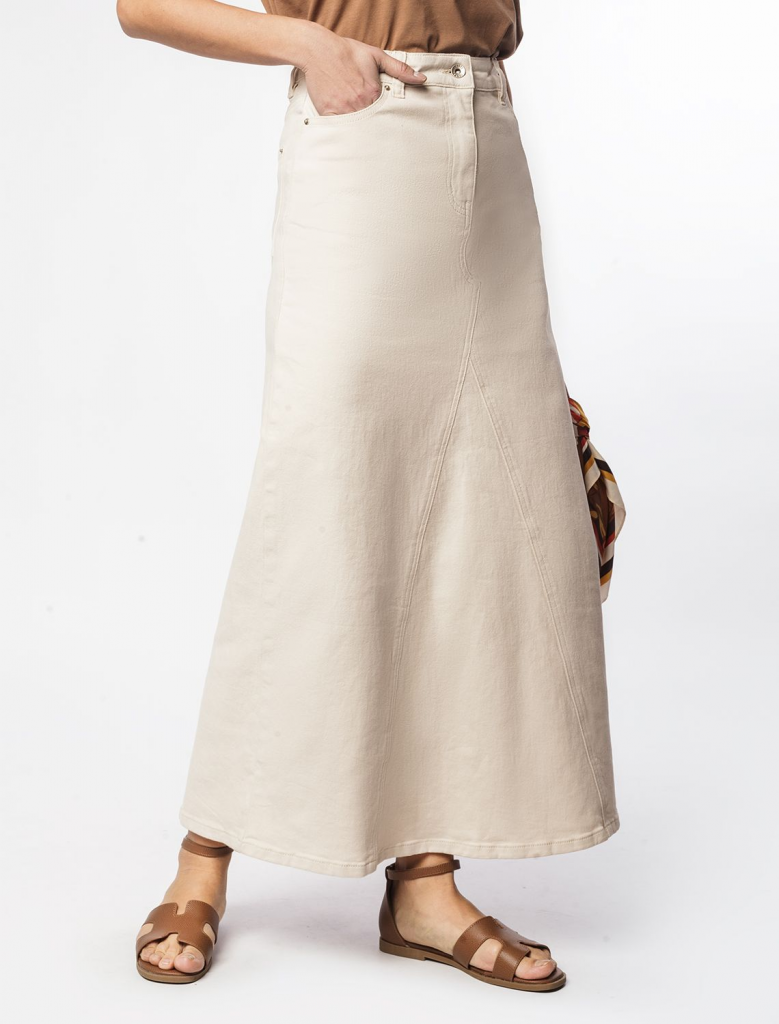 Юбка А-силуэта выполнена из денима с эластаном. Модель с посадкой на талии расширяется к низу за счет вставок из декоративных клиньев, расположенных спереди и сзади. Изделие дополнено пятью карманами как у джинс и брендированным патчем из эко-кожи. Сочетается в комплекте с курткой D51.033