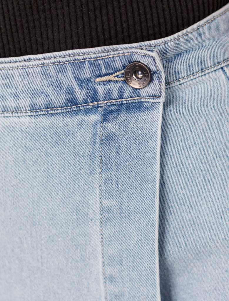 Юбка А-силуэта с застежкой на запАх выполнена из эластичного денима. Модель свободного кроя с посадкой на талии. Застежка на две пуговицы. Мягкий эластичный деним обеспечит комфорт и свободу движений. Хорошо сочетается с любым верхом и разной обувью.