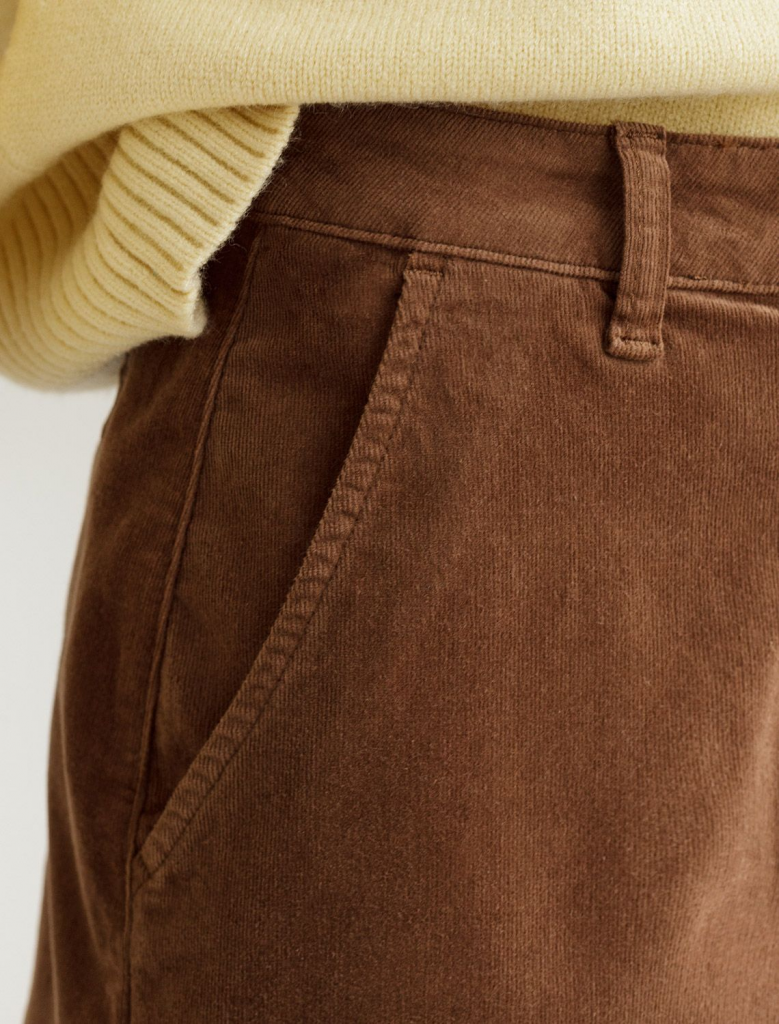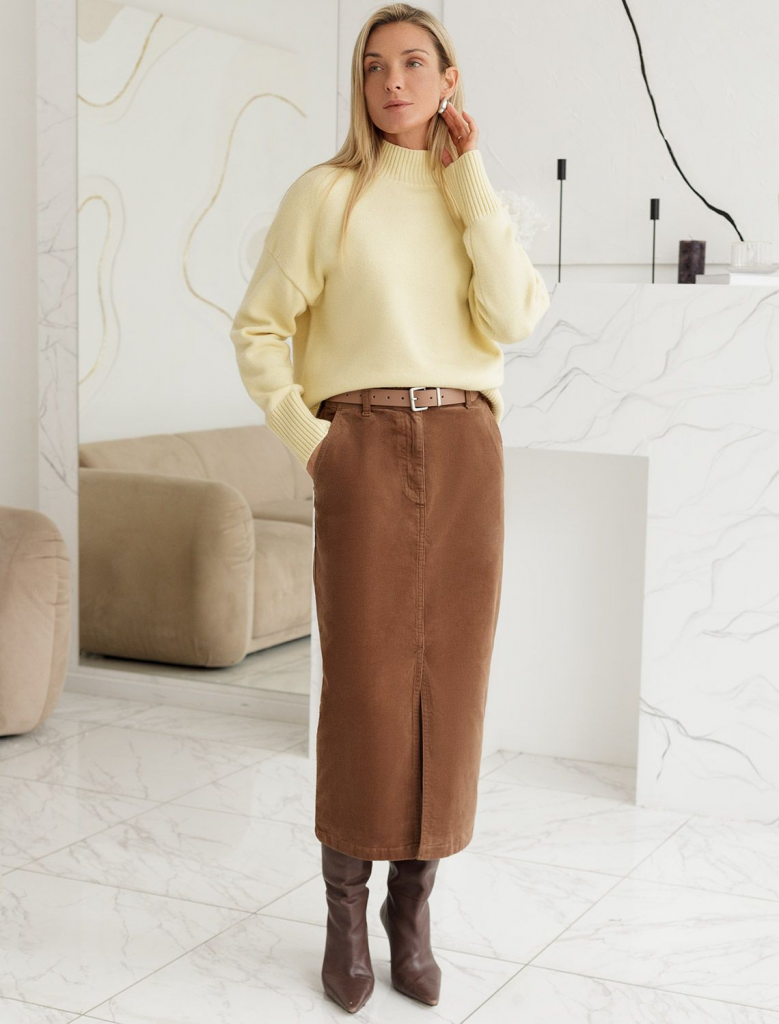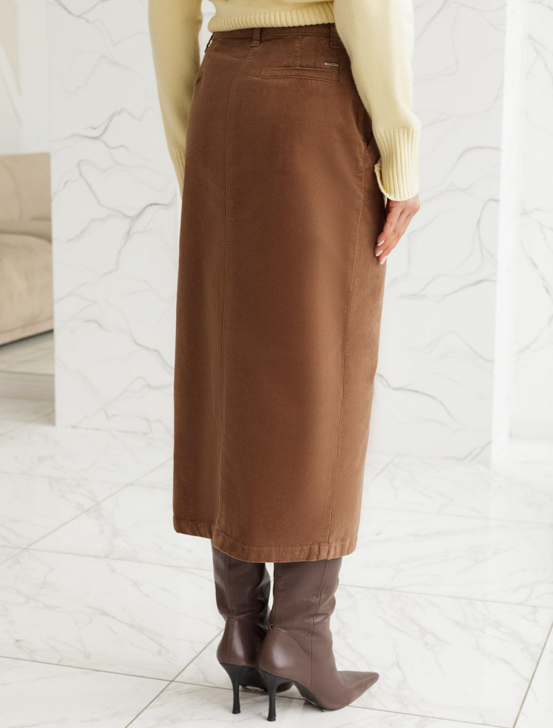 Юбка прямого кроя с выполнена из мягкого хлопкового микро-вельвета с добавлением эластана. Модель дополнена высоким разрезом спереди. Изделие комфортно садится по фигуре и не сковывает движения. Хорошо комбинируется с вязаным трикотажем, блузками и денимом. Также прекрасно станет альтернативой деловым низам в нестрогом офисном дресс-коде.