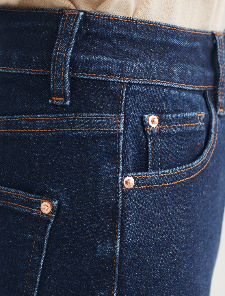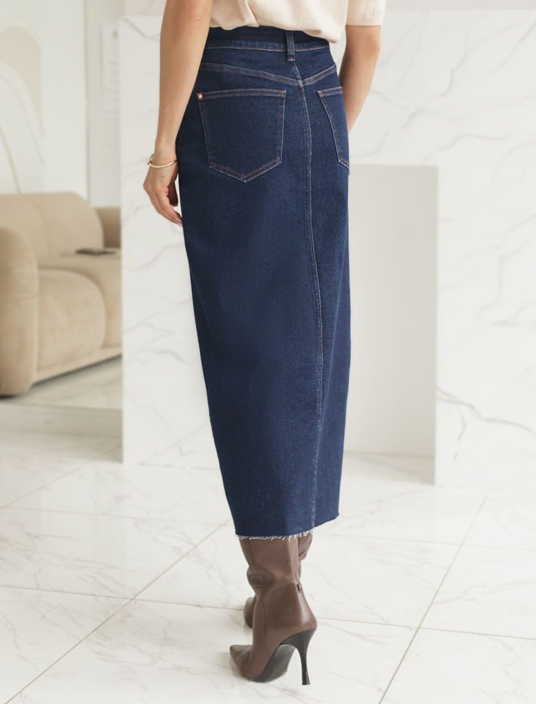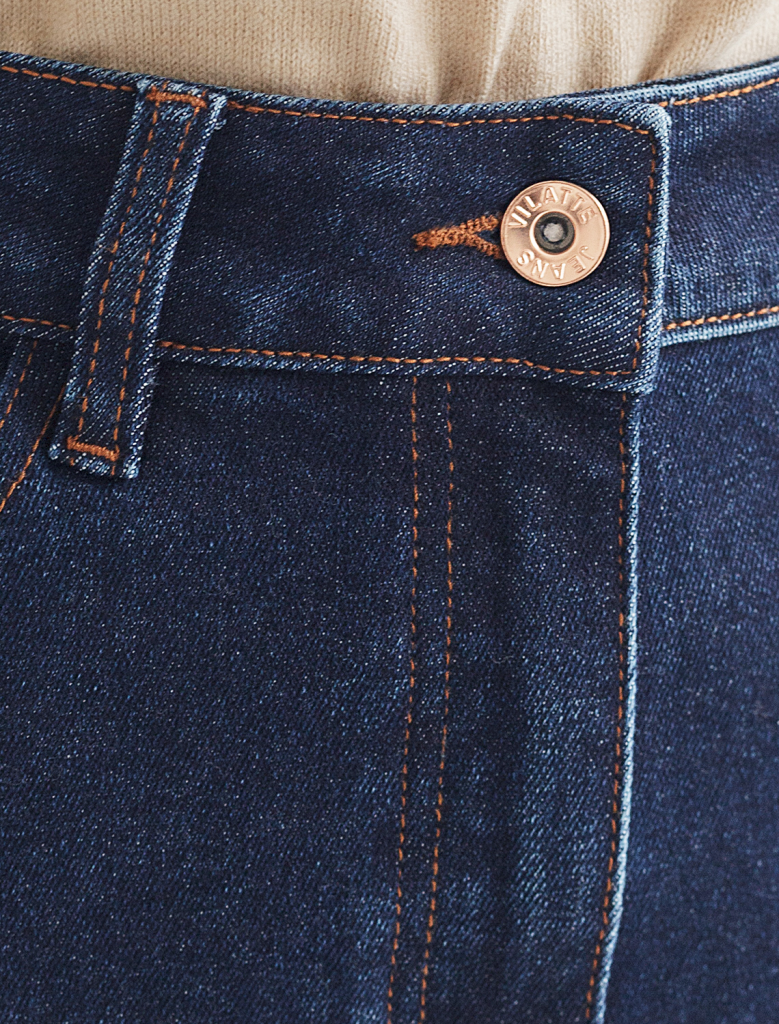 Удлиненная модель, прямого силуэта, с плотным прилеганием по бедрам. Высокий вырез спереди и классические джинсовые карманы спереди и сзади.