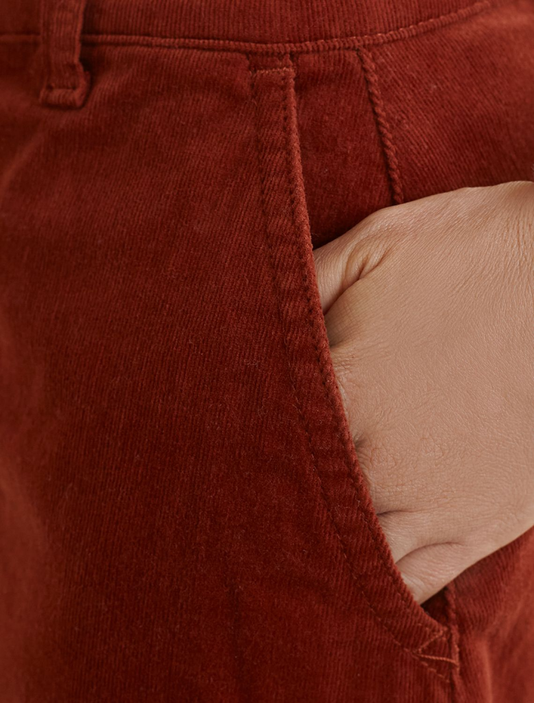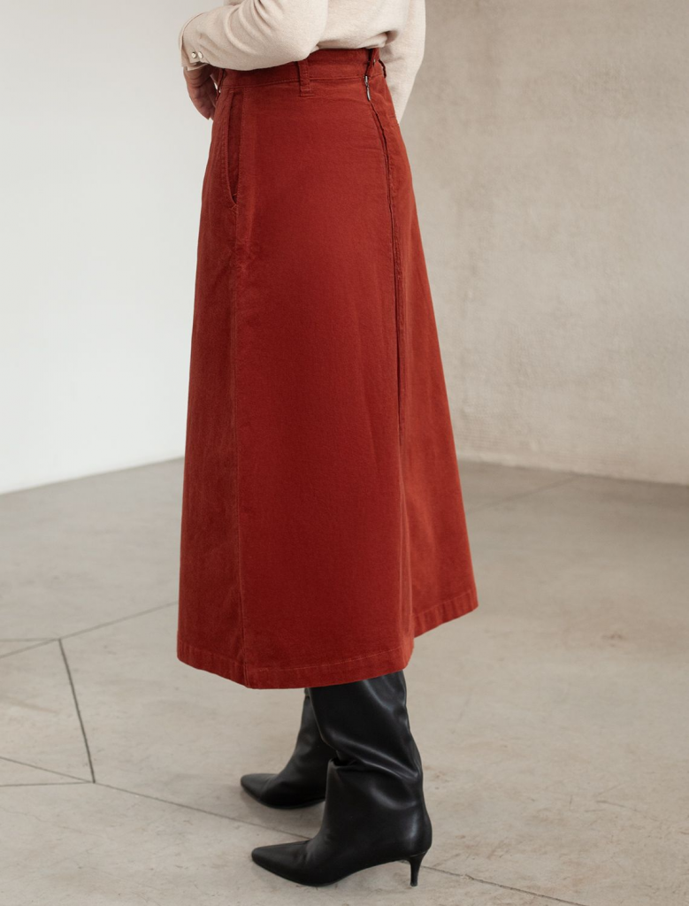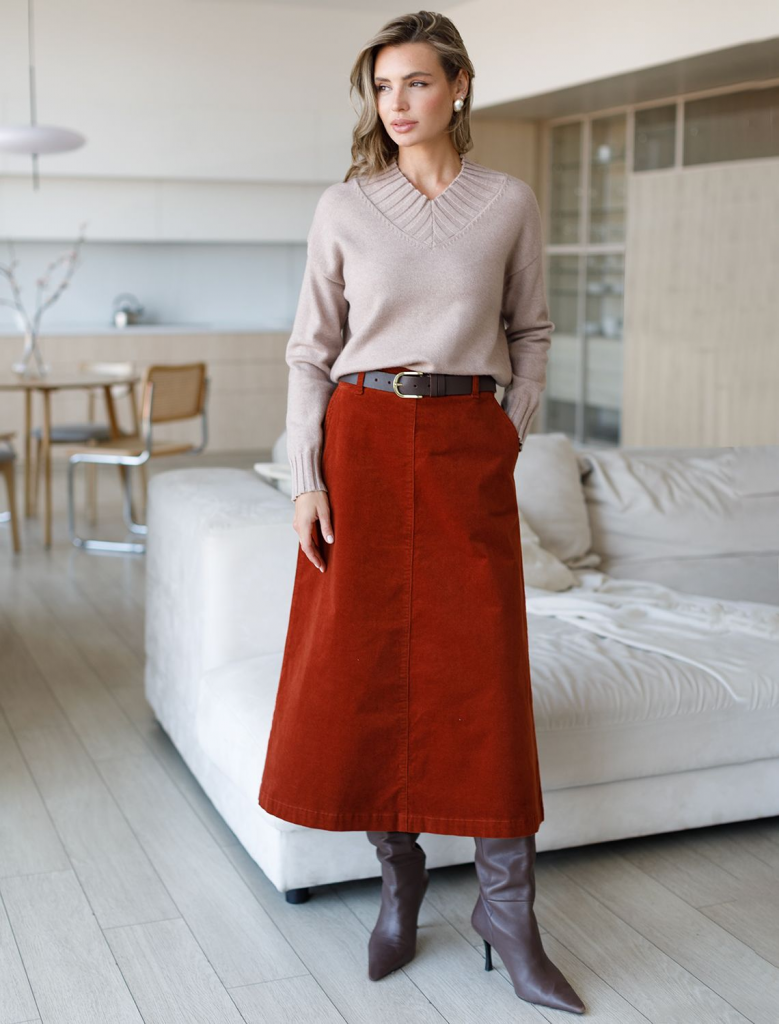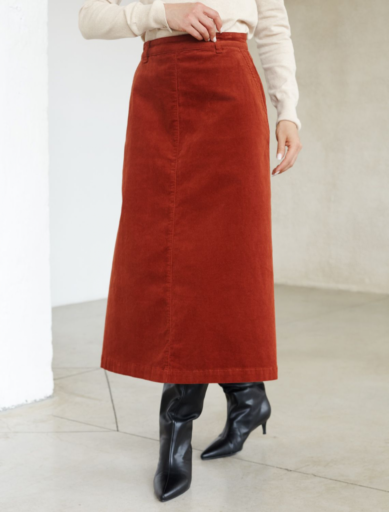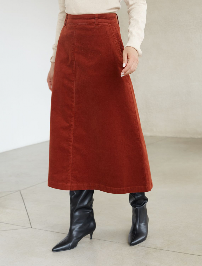 Юбка-миди трапециевидного силуэта выполнена из мягкого хлопкового микро-вельвета с добавлением эластана. Изделие комфортно садится по фигуре и не сковывает движения. Модель дополнена высококачественной фурнитурой с фирменным логотипом бренда. Хорошо комбинируется с вязаным трикотажем, блузками и денимом.Также прекрасно станет альтернативой деловым низам в нестрогом офисном дресс-коде.