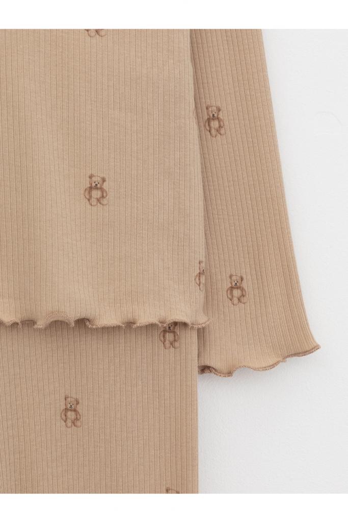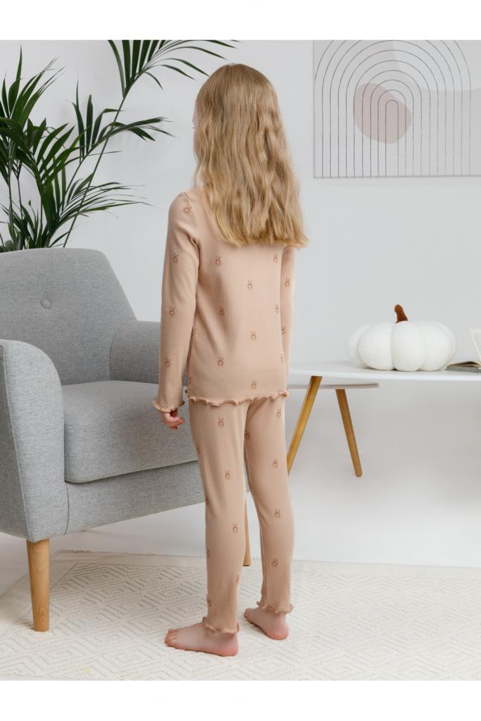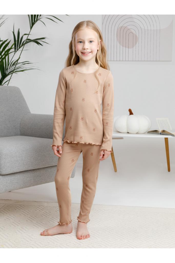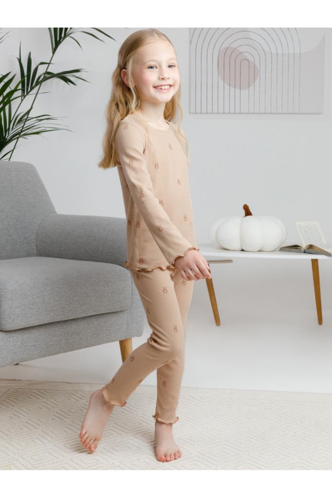 Трикотажная пижама в рубчик из натурального хлопка. Джемпер с длинными втачными рукавами и лосины с эластичной резинкой в поясе. Оригинальная набивка выполнена из стойких текстильных гипоаллергенных красителей. Изделие сохраняет цвет и форму после многократных стирок. Все трикотажные полотна производятся в соответствии с нормами швейцарского сертификата ЭкоТекс.