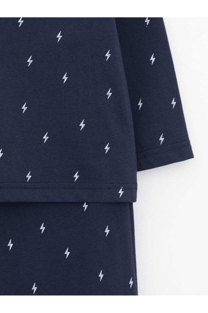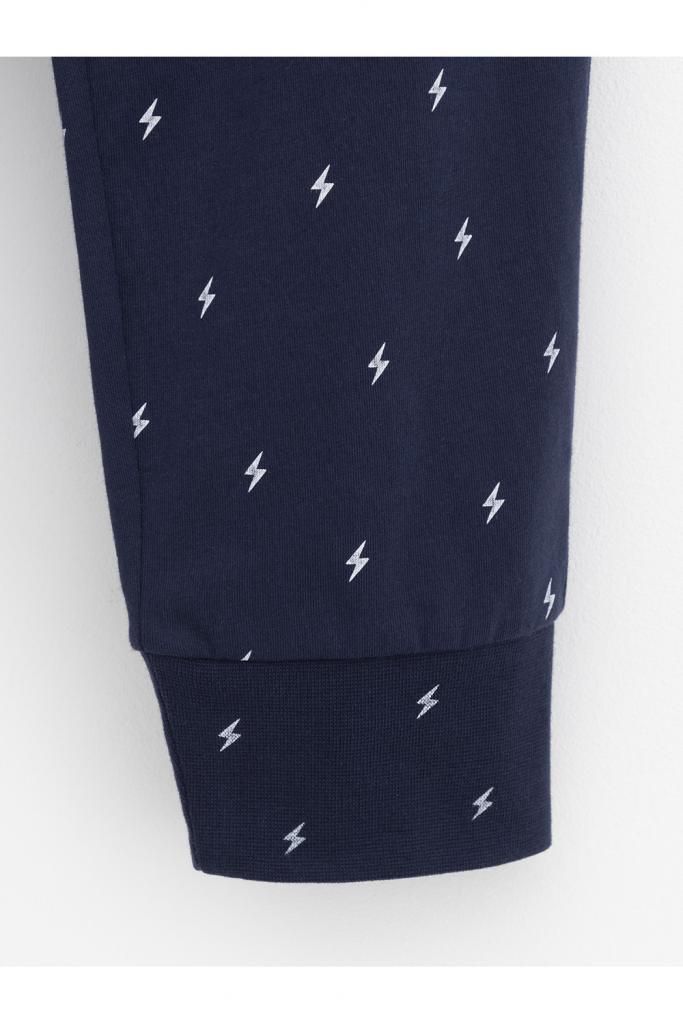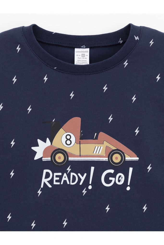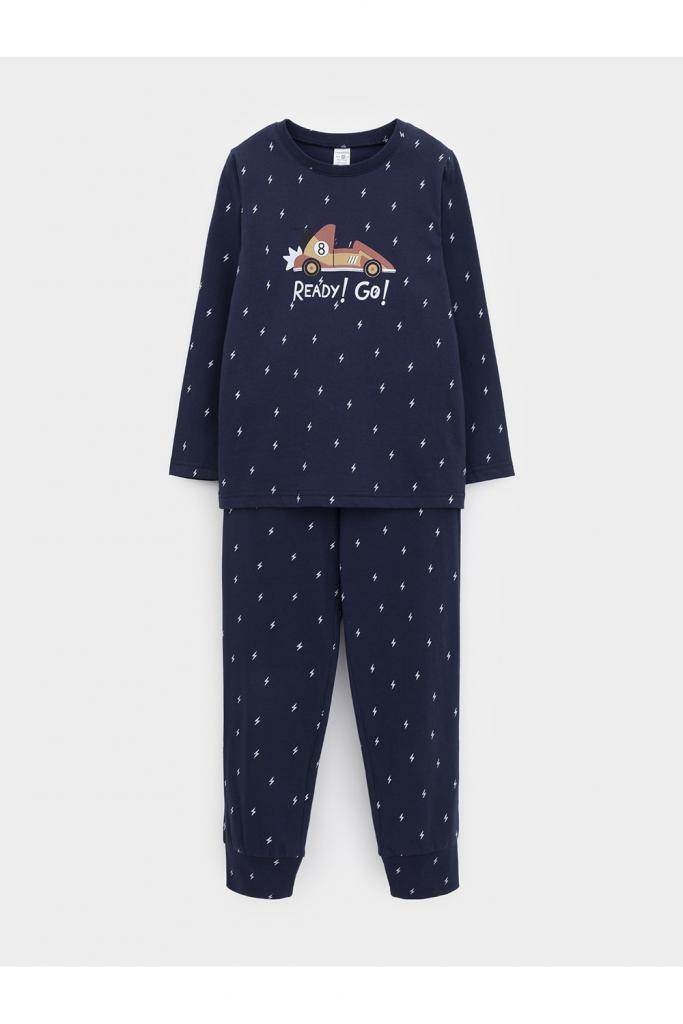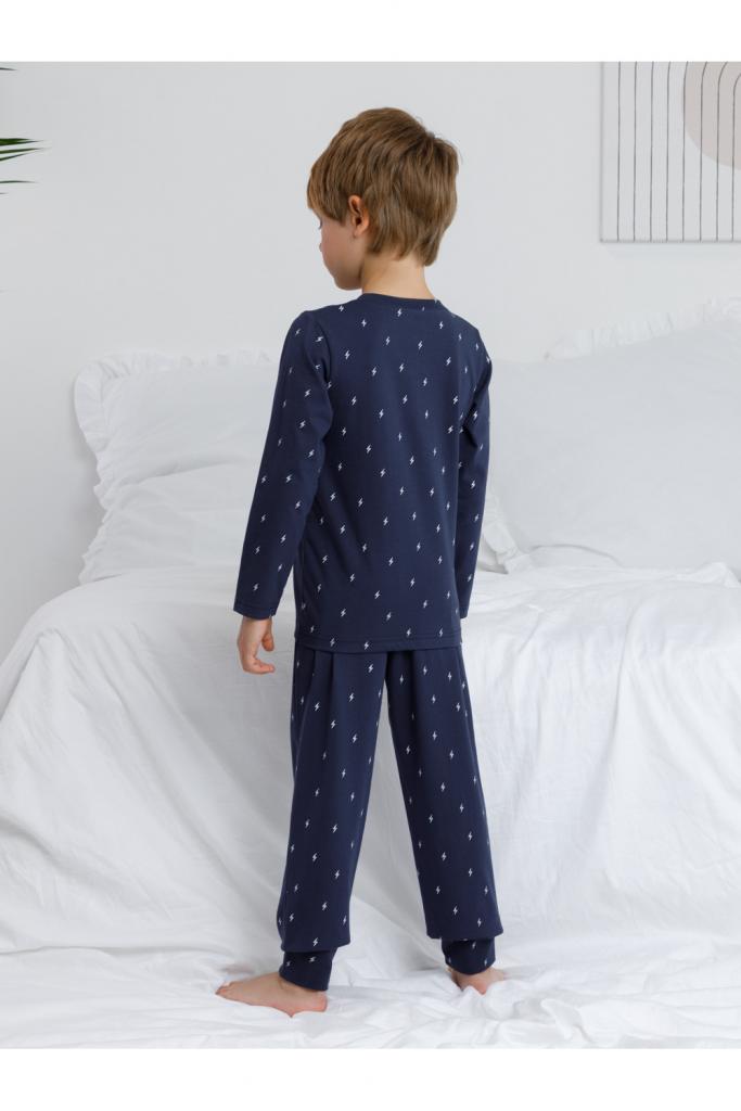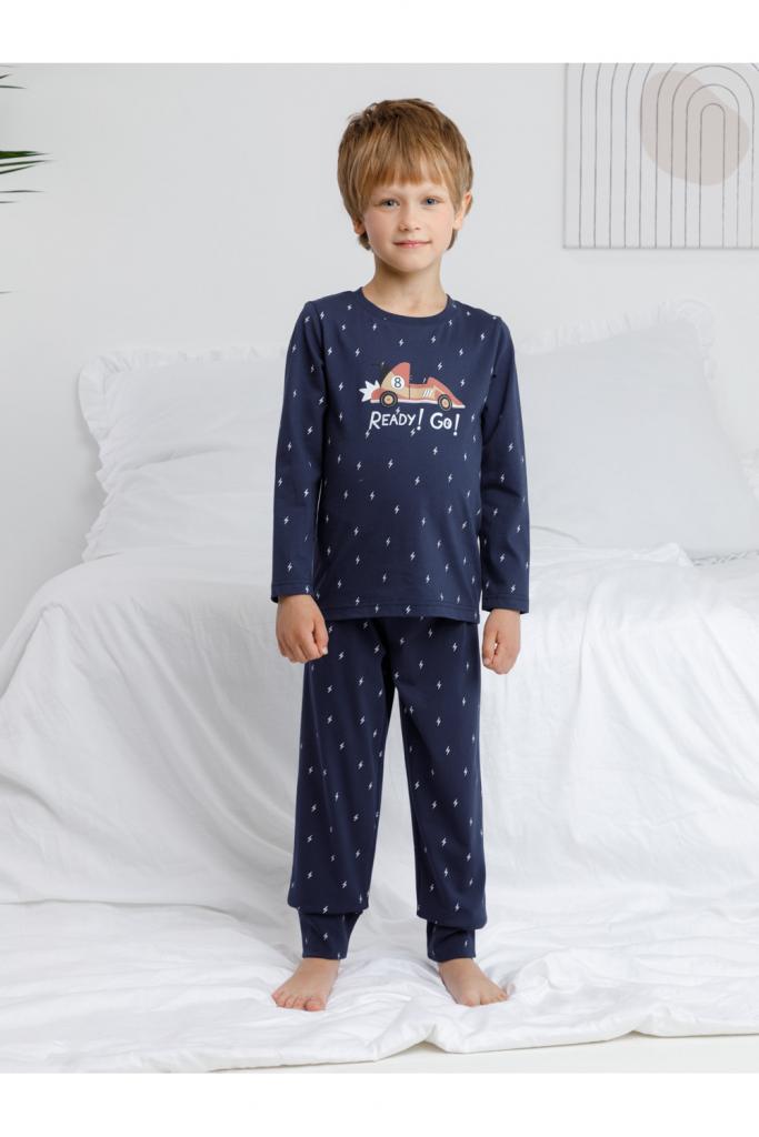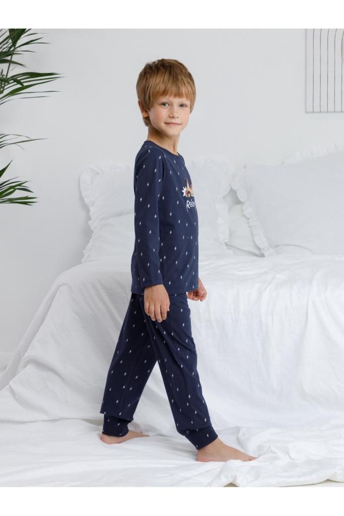 Пижама для мальчика из натурального хлопка. Джемпер с длинными втачными рукавами и брюки с эластичной резинкой в поясе. Мягкие манжеты по низу брюк сделаны из материала в рубчик. Оригинальная набивка и принт выполнены из стойких текстильных гипоаллергенных красителей. Изделие сохраняет цвет и форму после многократных стирок. Все трикотажные полотна производятся в соответствии с нормами швейцарского сертификата ЭкоТекс.