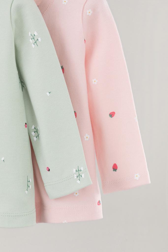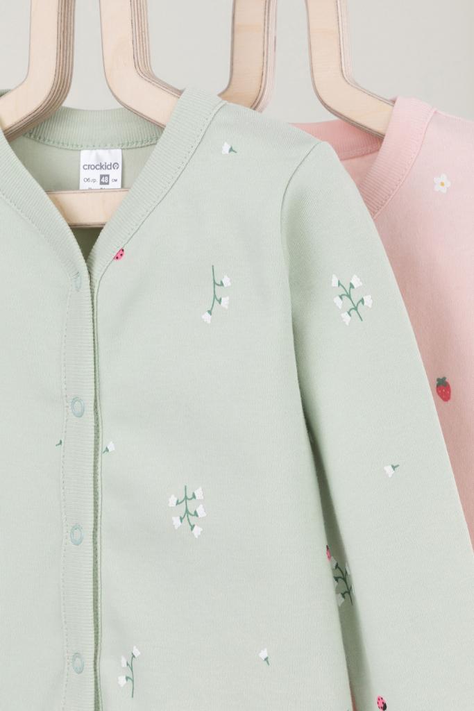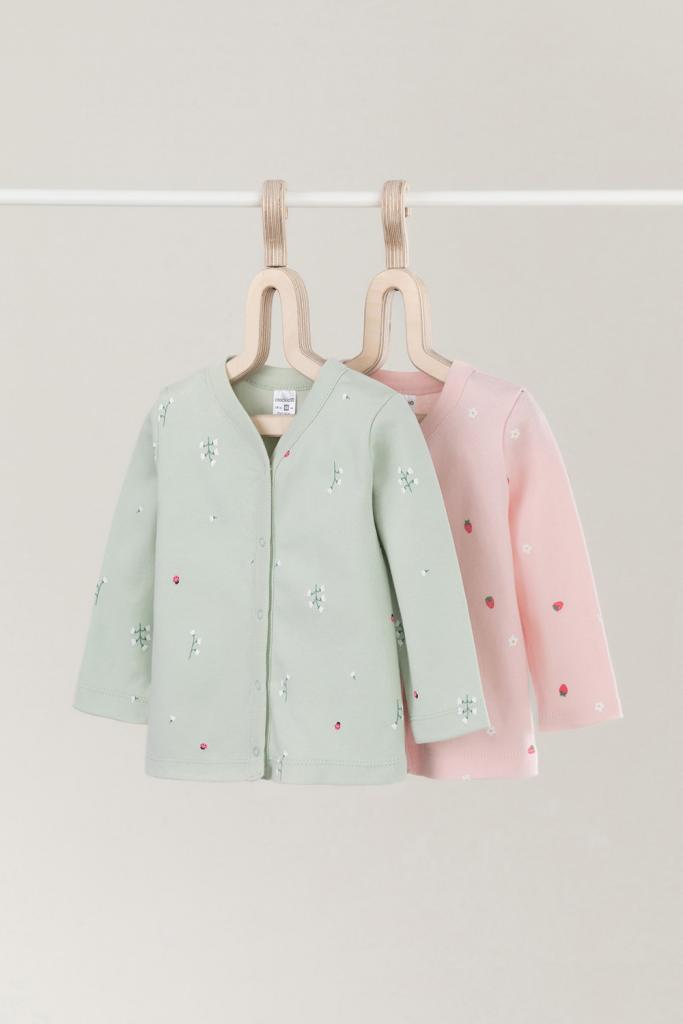 Кофточки для новорождённых из мягкого эластичного трикотажа интерлок, произведённого из натурального хлопка. В упаковке 2 штуки. Застёгиваются спереди на кнопки. В размере 56 на рукавах предусмотрены отвороты, швы выполнены наружу. Оригинальная набивка выполнена из стойких гипоаллергенных текстильных красителей. Все трикотажные полотна производятся в соответствии с нормами Швейцарского сертификата ЭкоТекс.