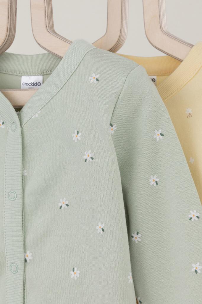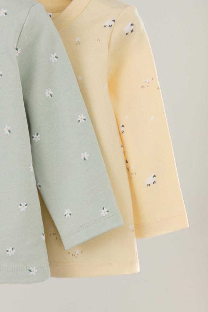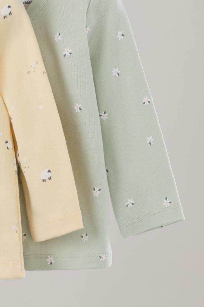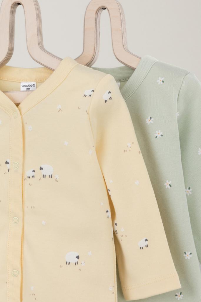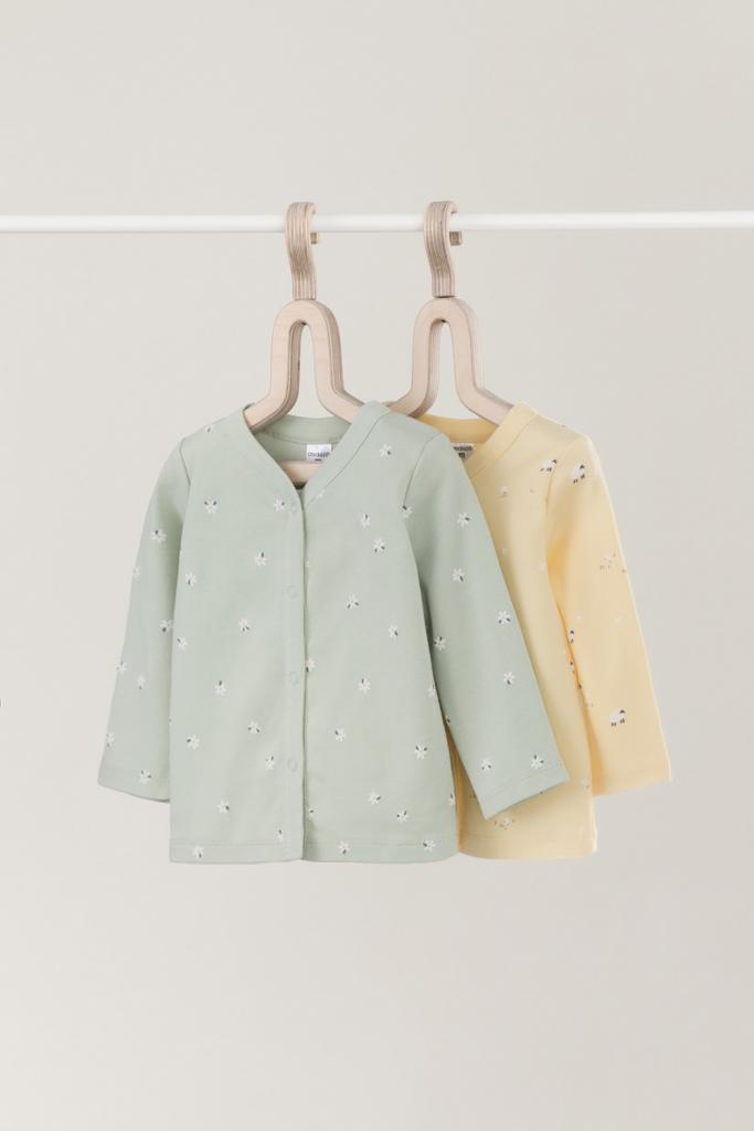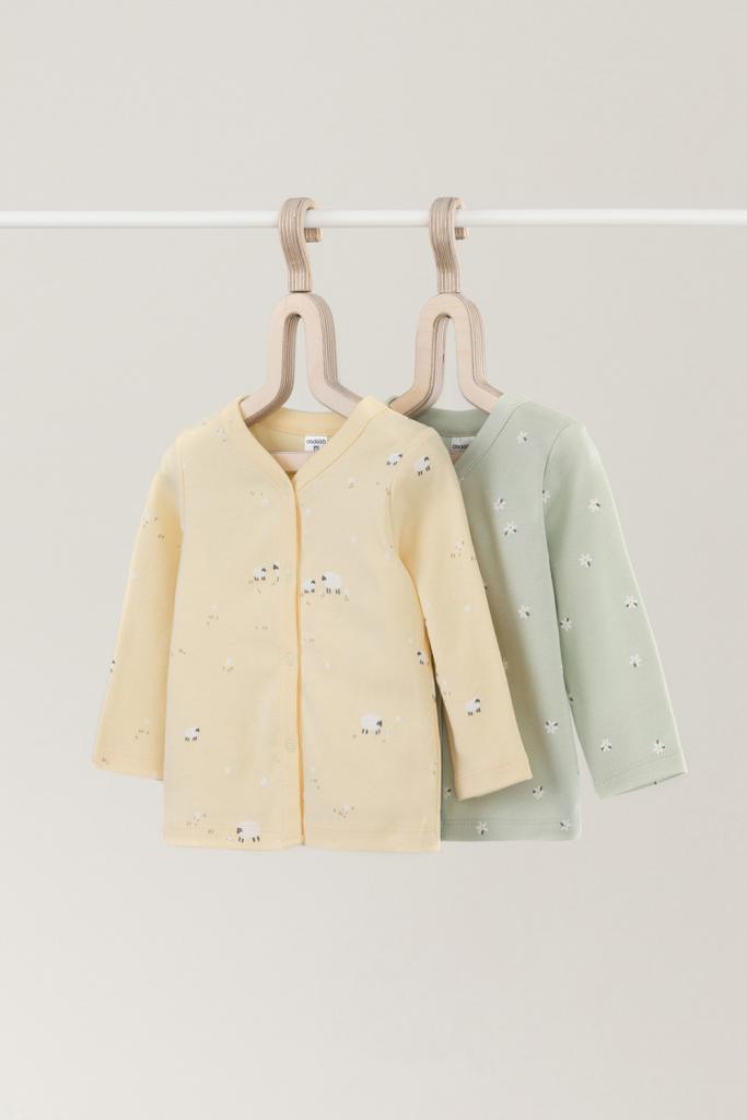 Кофточки для новорождённых из мягкого эластичного трикотажа интерлок, произведённого из натурального хлопка. В упаковке 2 штуки. Застёгиваются спереди на кнопки. В размере 56 на рукавах предусмотрены отвороты, швы выполнены наружу. Оригинальная набивка выполнена из стойких гипоаллергенных текстильных красителей. Все трикотажные полотна производятся в соответствии с нормами Швейцарского сертификата ЭкоТекс.