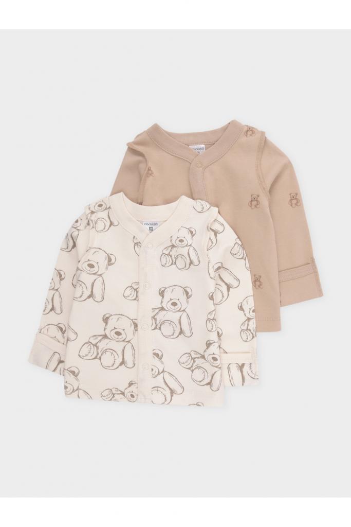 Кофточки для новорождённых из мягкого эластичного трикотажа интерлок, произведённого из натурального хлопка. В упаковке 2 штуки. Застёгиваются спереди на кнопки. В размере 56 на рукавах предусмотрены отвороты, швы выполнены наружу. Оригинальная набивка и принт выполнены из стойких гипоаллергенных текстильных красителей. Все трикотажные полотна производятся в соответствии с нормами Швейцарского сертификата ЭкоТекс.