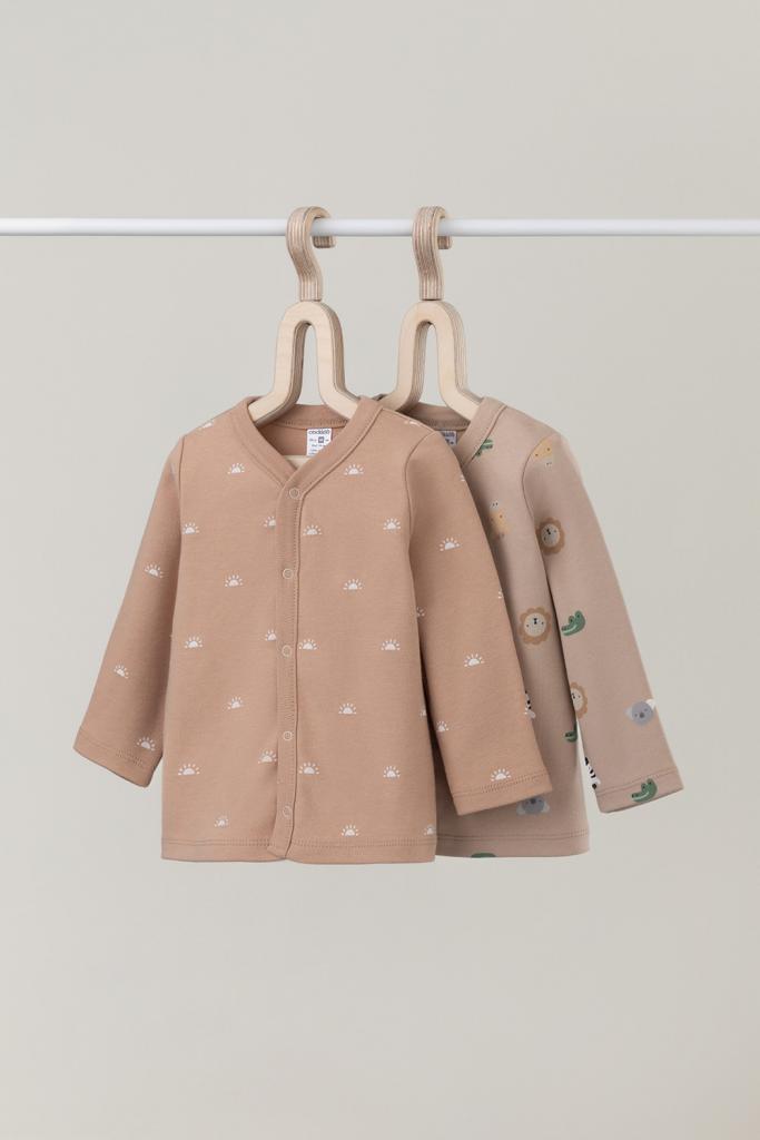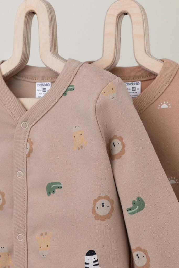 Кофточки для новорождённых из мягкого эластичного трикотажа интерлок, произведённого из натурального хлопка. В упаковке 2 штуки. Застёгиваются спереди на кнопки. В размере 56 на рукавах предусмотрены отвороты, швы выполнены наружу. Оригинальная набивка выполнена из стойких гипоаллергенных текстильных красителей. Все трикотажные полотна производятся в соответствии с нормами Швейцарского сертификата ЭкоТекс.