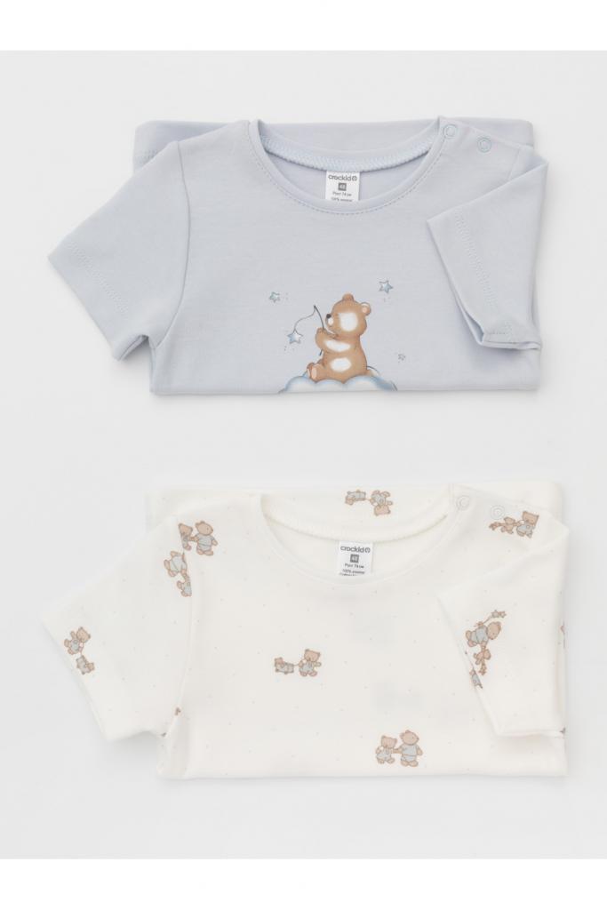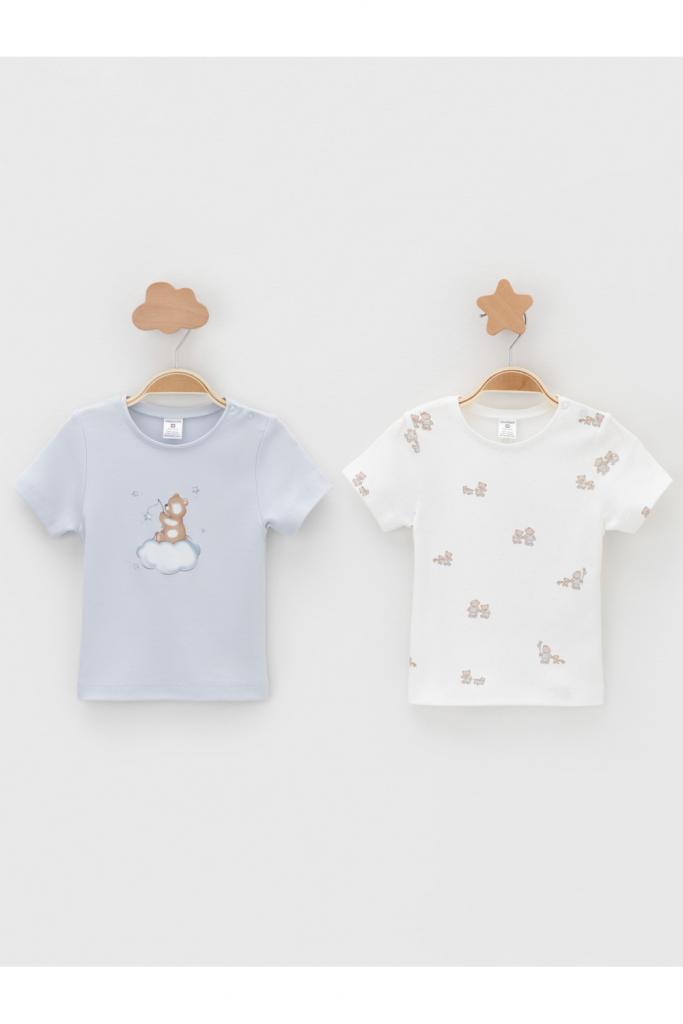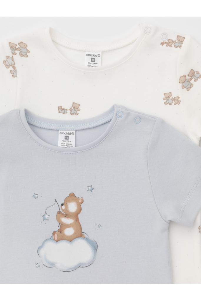 Футболки для мальчика из высококачественного трикотажа, произведённого из натурального хлопка. В упаковке 2 штуки. Для удобства на плече застёжка на кнопки. Оригинальная набивка и принт выполнены из стойких гипоаллергенных текстильных красителей. Все трикотажные полотна производятся в соответствии с нормами швейцарского сертификата ЭкоТекс.