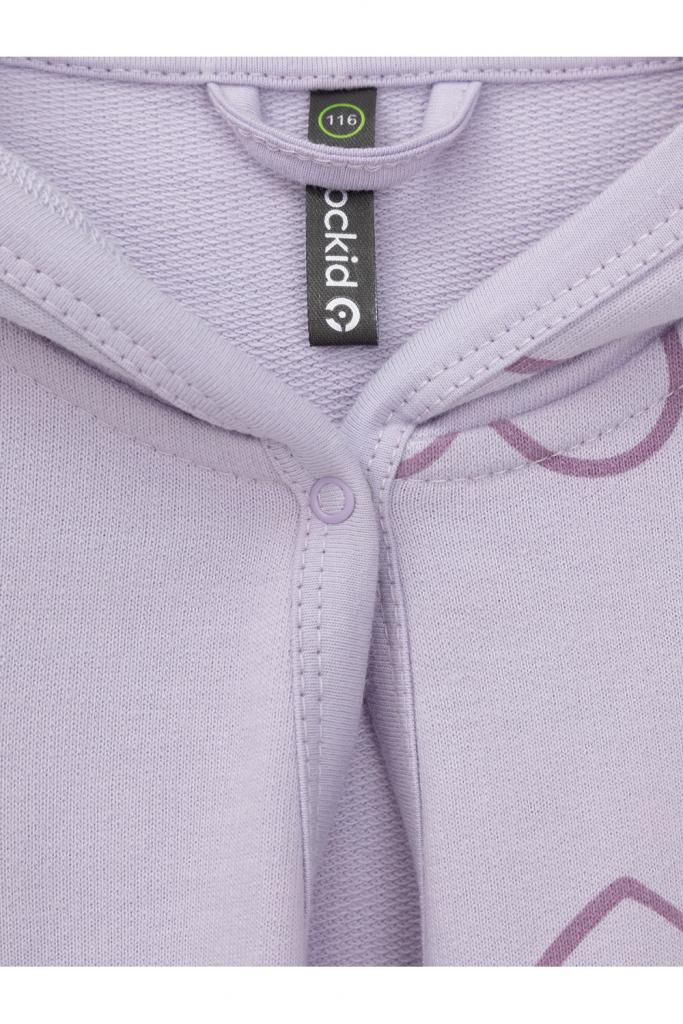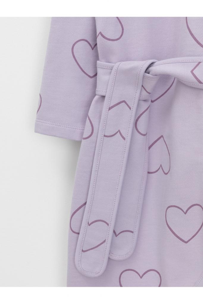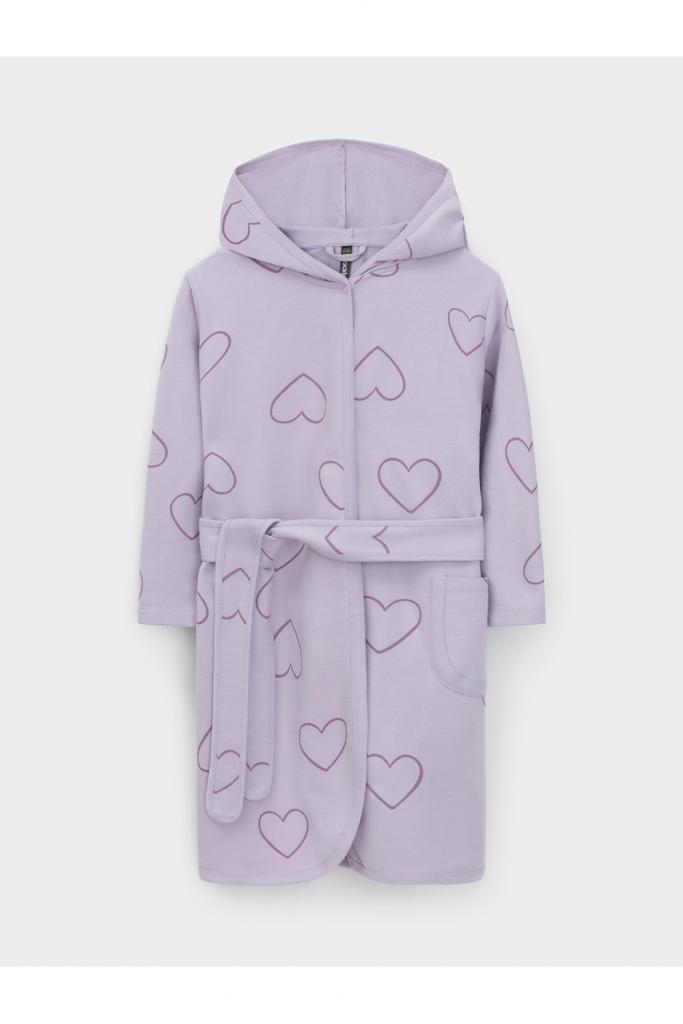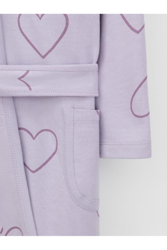 Халат с тонким капюшоном и поясом из набивного хлопкового трикотажа футер петля. Края обработаны мягким кантом. Накладной карман уходит в шов. Пояс продет в шлевки. Длинные рукава обработаны плоскими швами.