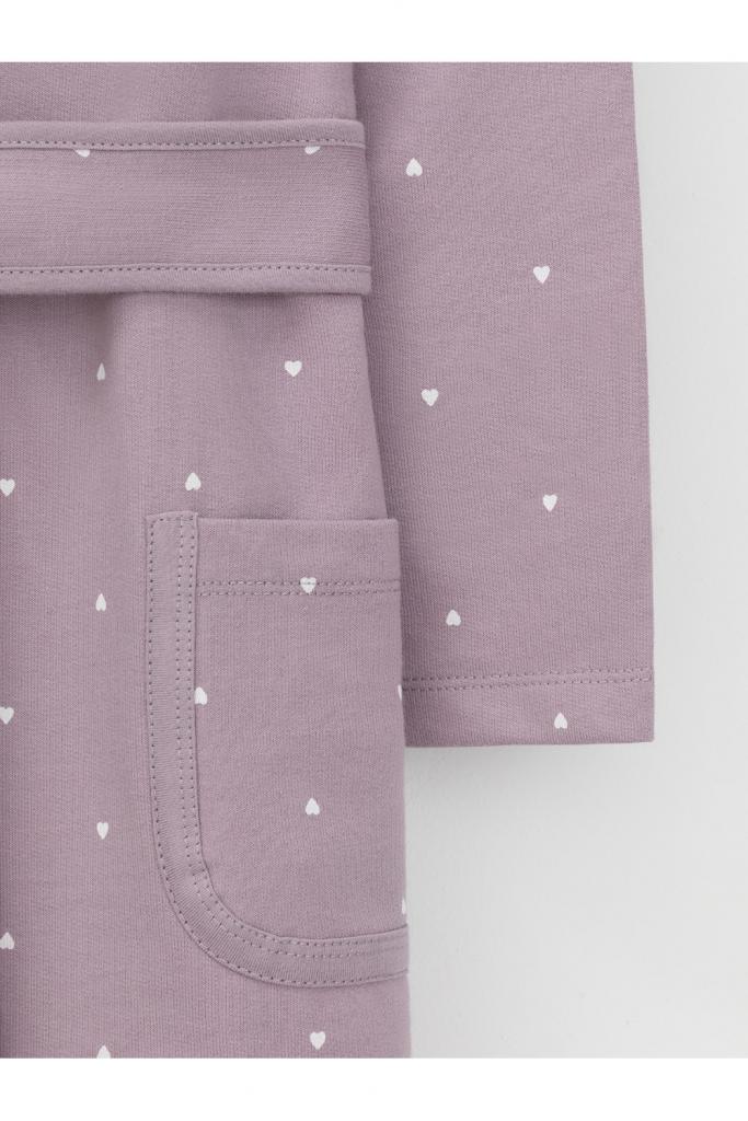 Халат с тонким капюшоном и поясом из набивного хлопкового трикотажа футер петля. Края обработаны мягким кантом. Накладной карман уходит в шов. Пояс продет в шлевки. Длинные рукава обработаны плоскими швами.