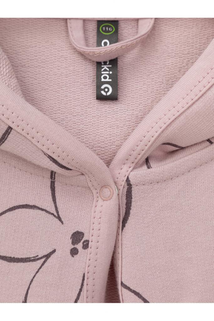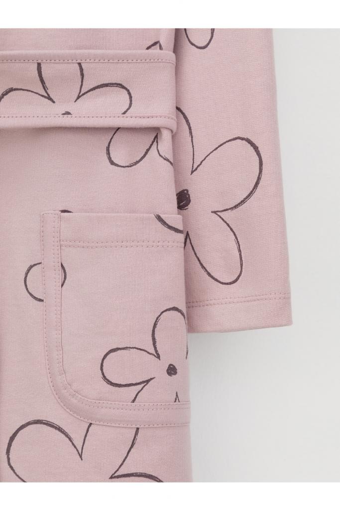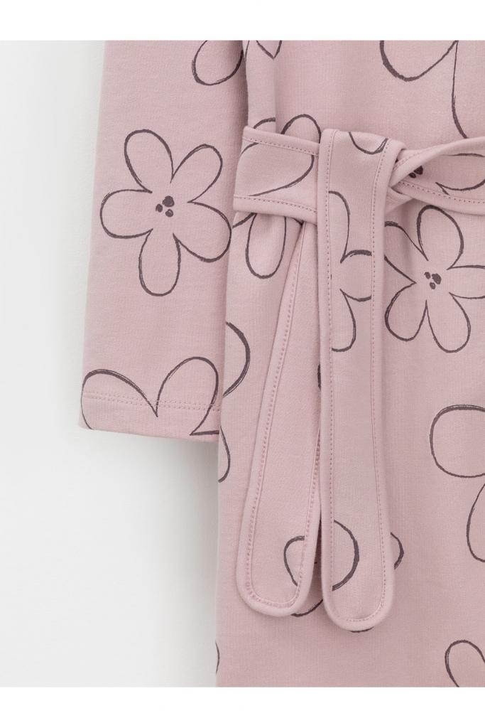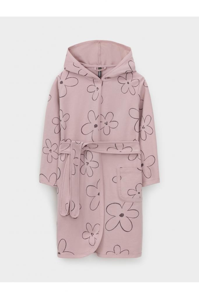 Халат с тонким капюшоном и поясом из набивного хлопкового трикотажа футер петля. Края обработаны мягким кантом. Накладной карман уходит в шов. Пояс продет в шлевки. Длинные рукава обработаны плоскими швами.