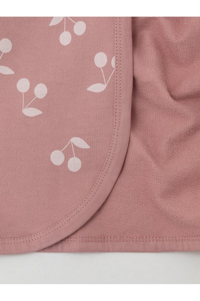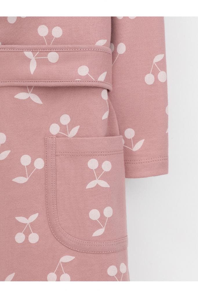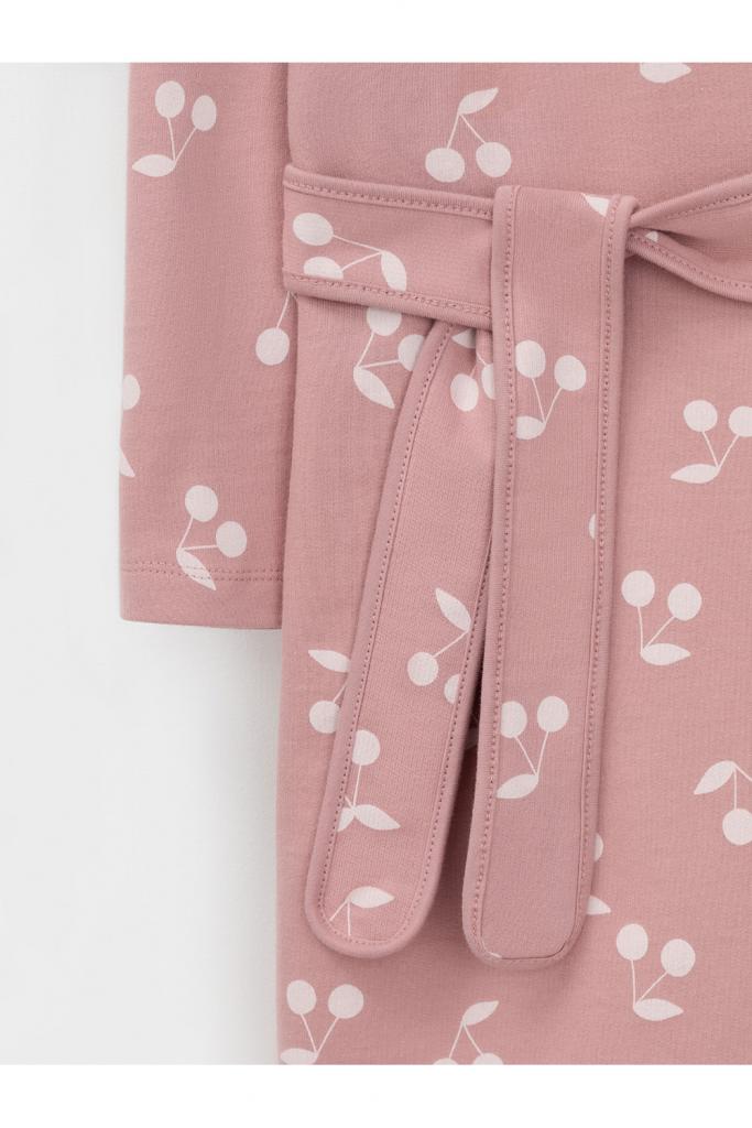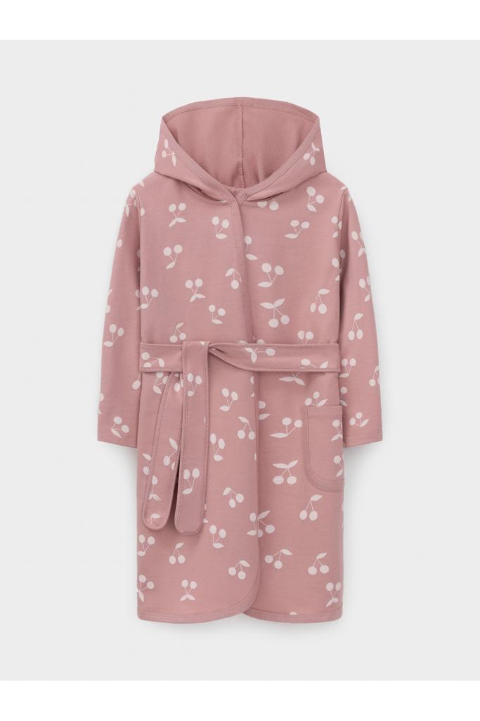 Халат с тонким капюшоном и поясом из набивного хлопкового трикотажа футер петля. Края обработаны мягким кантом. Накладной карман уходит в шов. Пояс продет в шлевки. Длинные рукава обработаны плоскими швами.