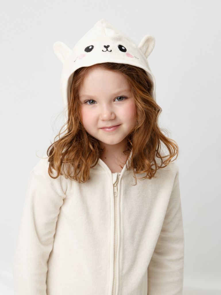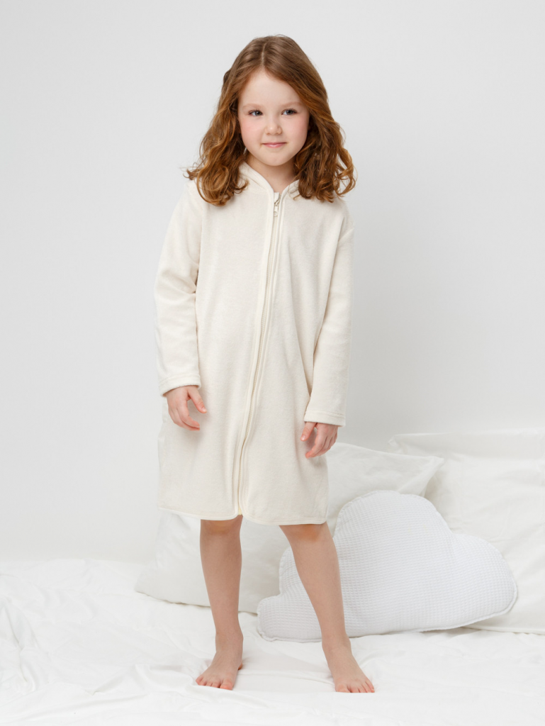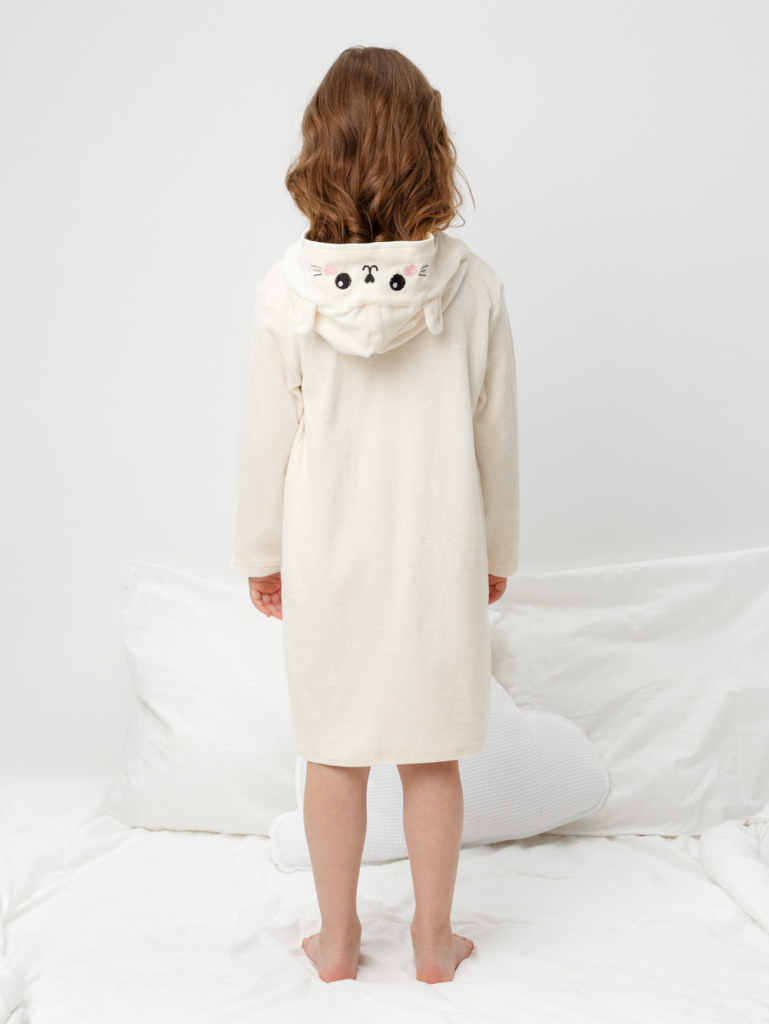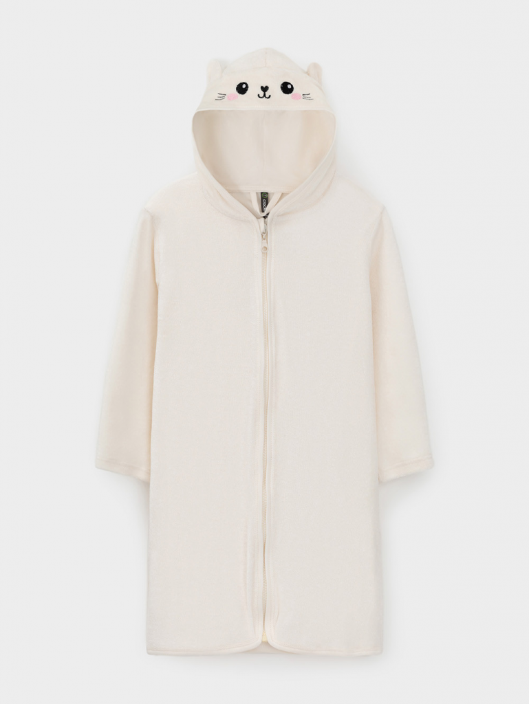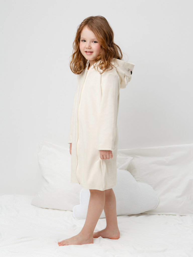 Халат на молнии с капюшоном. Изготовлен из мягкого махрового полотна, произведённого из натурального хлопка. В капюшоне подклад из высококачественного гладкого трикотажа супрем. Изделие украшено вышивкой и декоративными ушками. Края обработаны эластичным кантом. Все трикотажные полотна производятся в соответствии с нормами швейцарского сертификата ЭкоТекс.