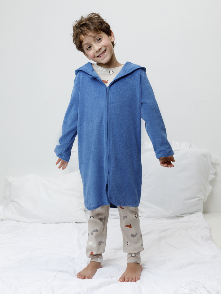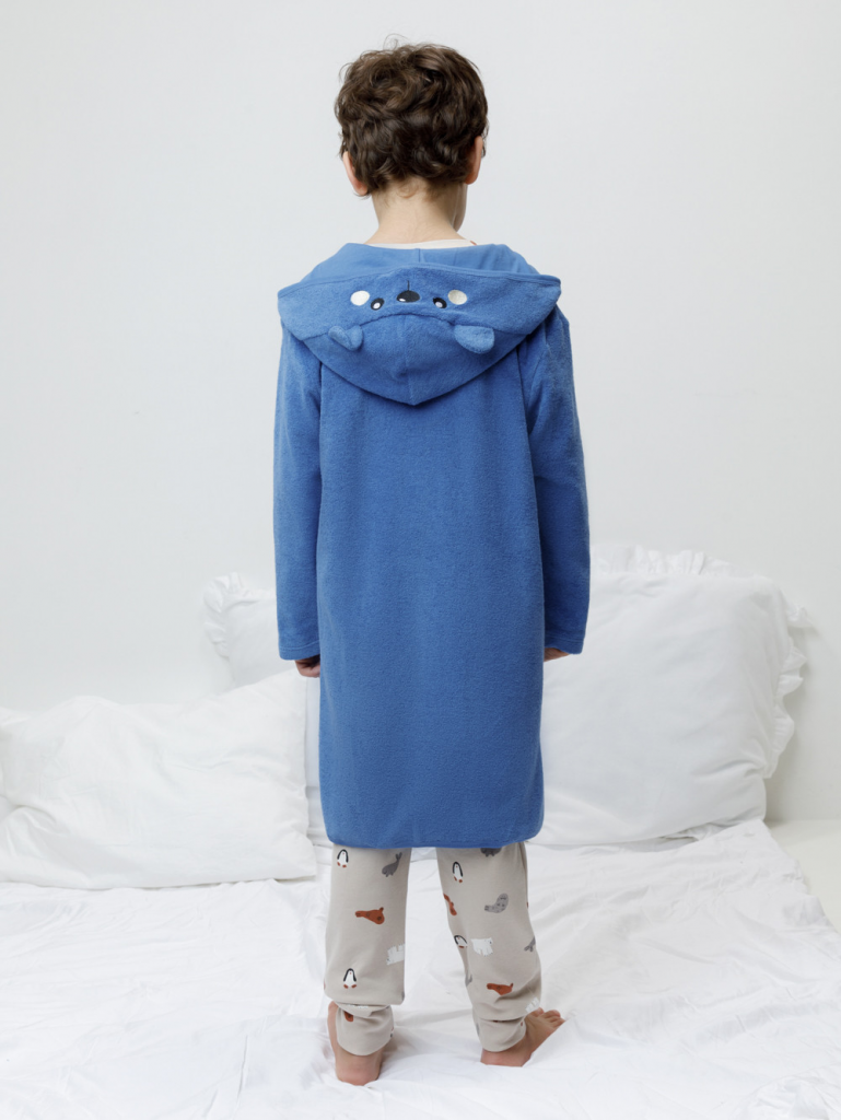 Халат на молнии с капюшоном. Изготовлен из мягкого махрового полотна, произведённого из натурального хлопка. В капюшоне подклад из высококачественного гладкого трикотажа супрем. Изделие украшено вышивкой и декоративными ушками. Края обработаны эластичным кантом. Все трикотажные полотна производятся в соответствии с нормами швейцарского сертификата ЭкоТекс.