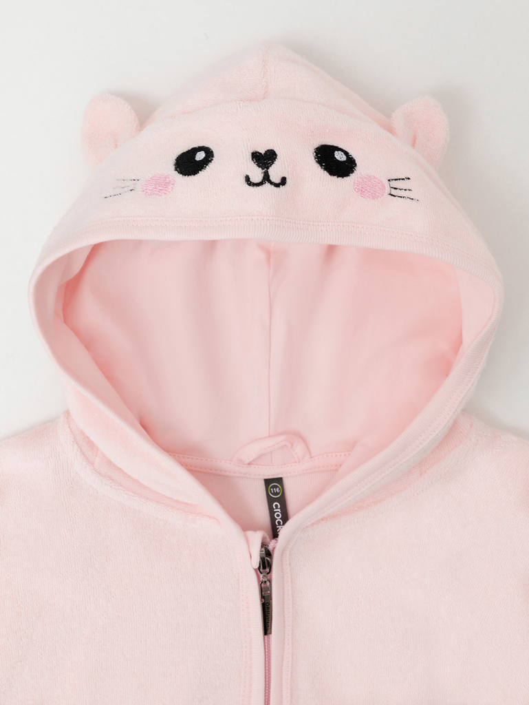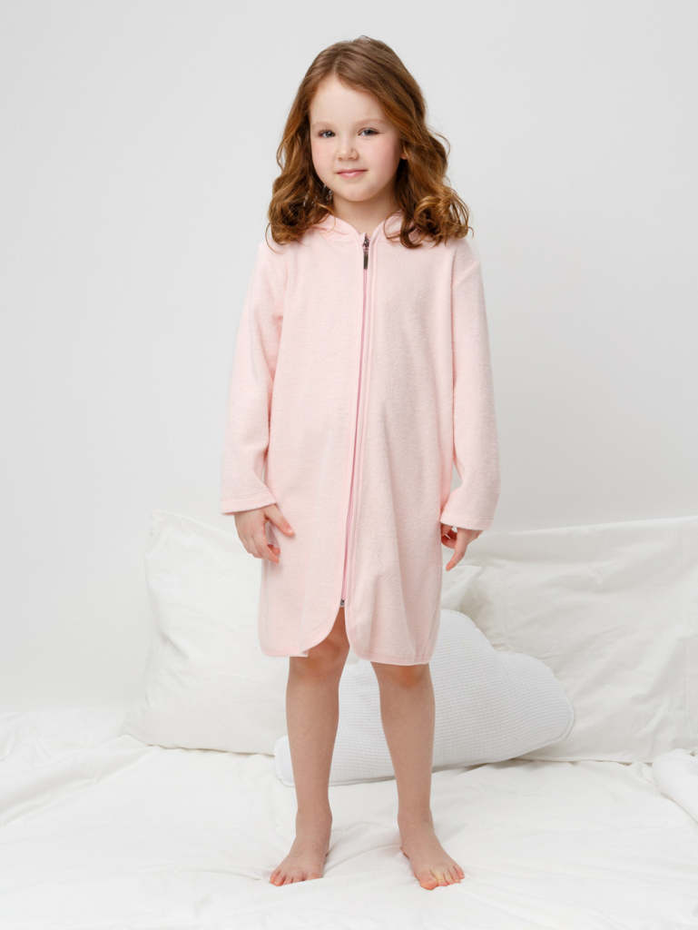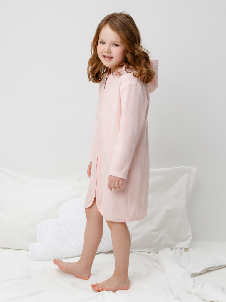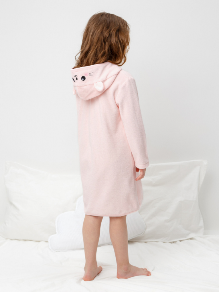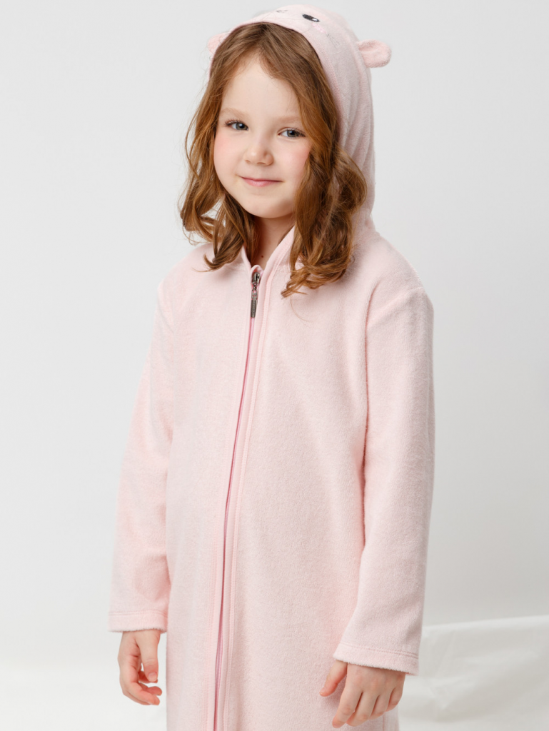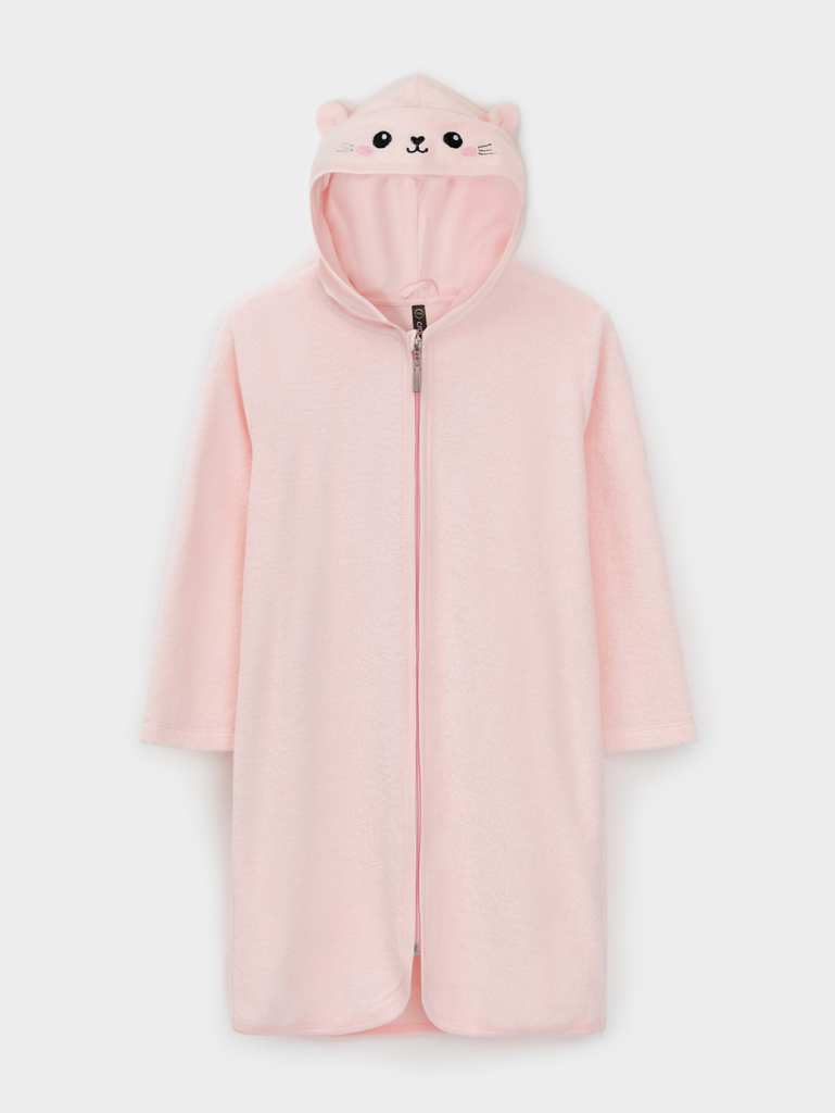 Халат на молнии с капюшоном. Изготовлен из мягкого махрового полотна, произведённого из натурального хлопка. В капюшоне подклад из высококачественного гладкого трикотажа супрем. Изделие украшено вышивкой и декоративными ушками. Края обработаны эластичным кантом. Все трикотажные полотна производятся в соответствии с нормами швейцарского сертификата ЭкоТекс.