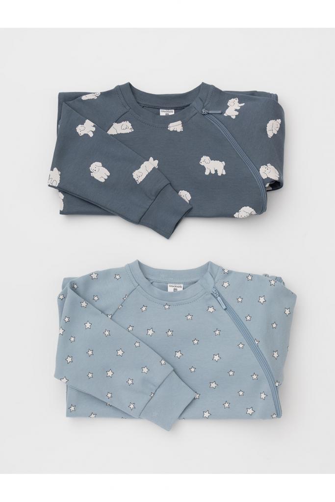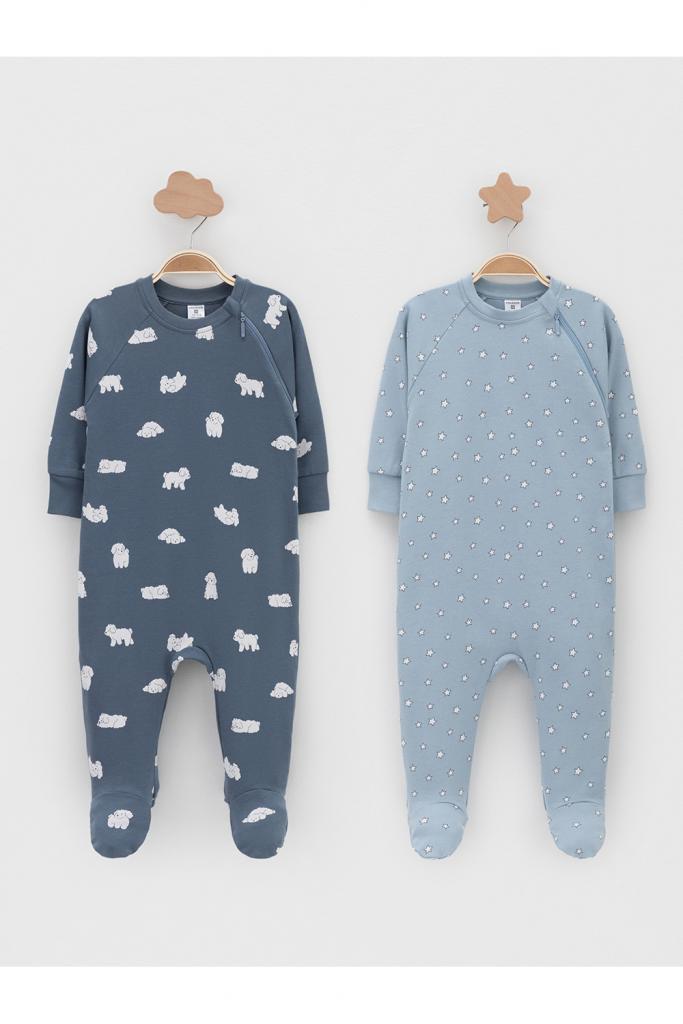 Комбинезоны для новорождённых из мягкого эластичного трикотажа интерлок, произведённого из натурального хлопка. В упаковке 2 штуки. Застёгиваются сбоку на молнию с мягкой защитой шеи и подбородка. Длинные рукава-реглан оканчиваются манжетами. Оригинальная набивка выполнена из стойких гипоаллергенных текстильных красителей. Все трикотажные полотна производятся в соответствии с нормами швейцарского сертификата ЭкоТекс.